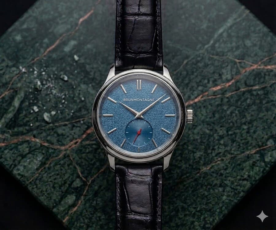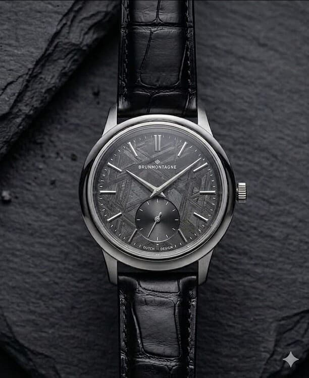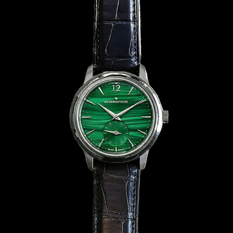 Ik zou wel nog nieuwsgierig zijn naar een voorbeeld van onderstaande plaat van je website (zowel de structuur als de gladde sunburst) maar dan met een andere kleur seconde (goud/brons/rosegoud o.i.d) en het brunmontagnelogo in de zelfde kleur als de seconde.