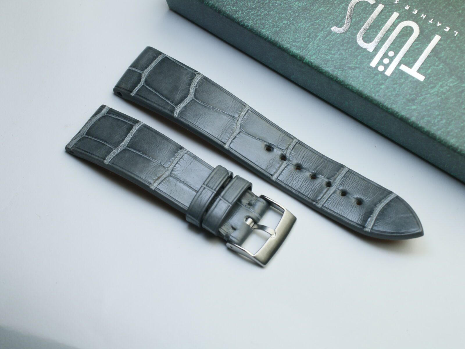 Ik zou het horloge graag op licht grijs suède en n zwarte croco leer hebben.