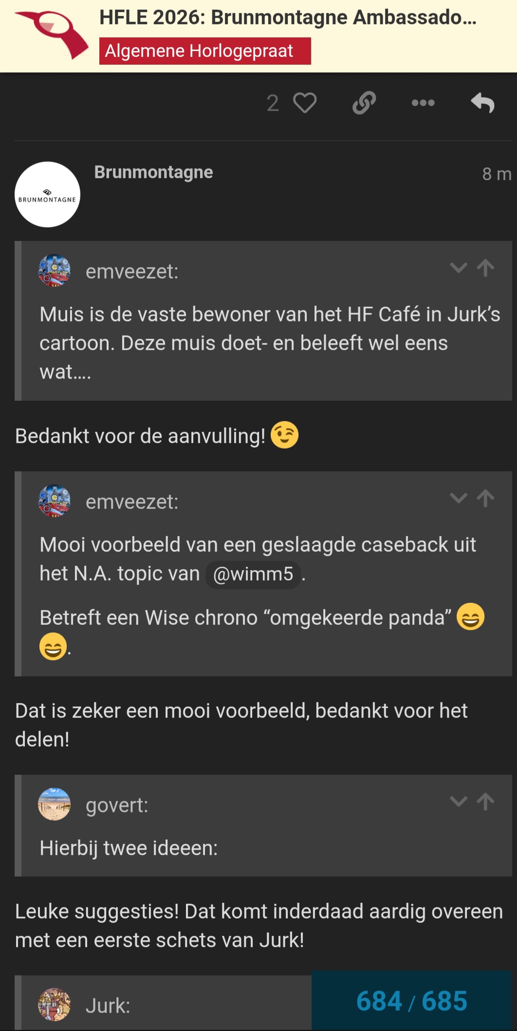 Je weet Pascal, zeg hier niet zoveel maar die muis op de HFLE zou grandioos zijn. Relatie Ambassador met de muis is niet zo moeilijk toch. Ambassador van Brunmontagne als HFLE speciaal voor het forum. Dan zou het toch leuk zijn die twist met een legende als Jurk met de muis op de case back, liefst in kleur natuurlijk maar snap dat dit lastig is. Maar leuk als we zowel jou als Jurk de credits geven, echt een HFLE dus ![]()
