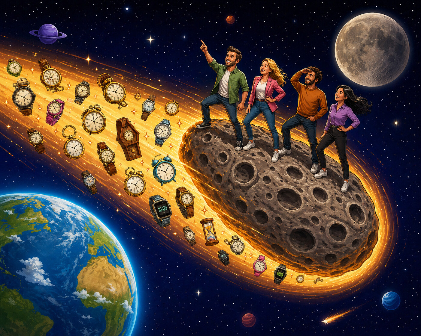Misschien zoiets? HF leden op een meteoriet door de ruimte ![]()