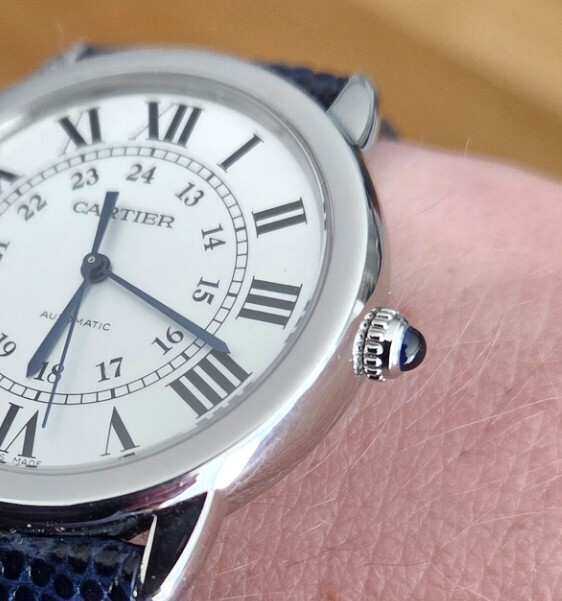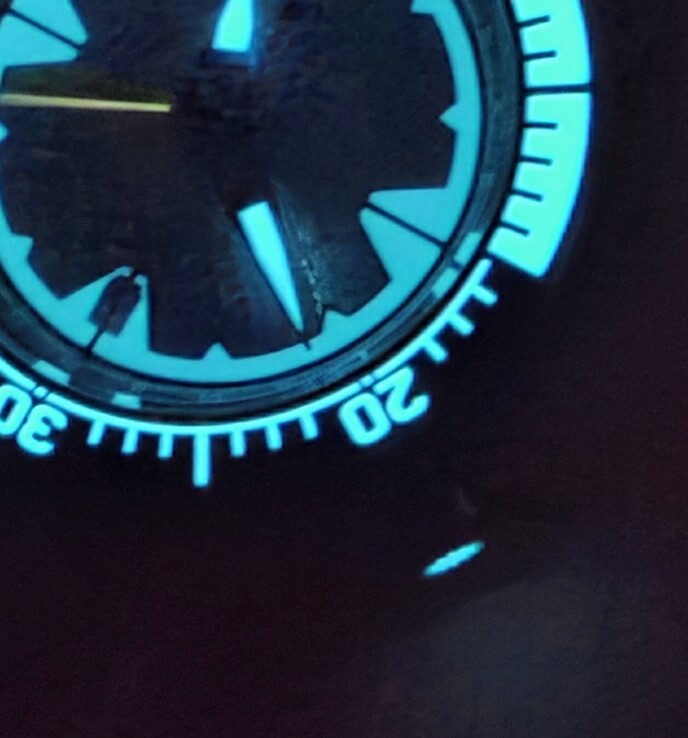 Het is ongetwijfeld een stretch, maar zou je een inlay van het materiaal van de wijzerplaat kunnen inleggen in de kroon? ![]()