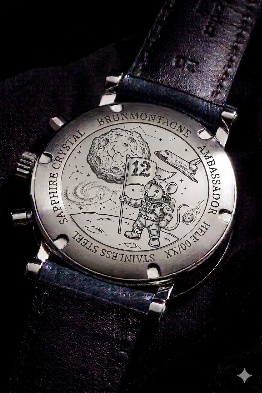 Doe geen gelul. Gewoon een nette gravure. Het liefst horseshoe. Ambassador - Water Resist x bar - SS en dan xxx/yyyy als serienummer. Voor wie nu denkt “hee, dat bedenkt hij strak”… Nee hoor: