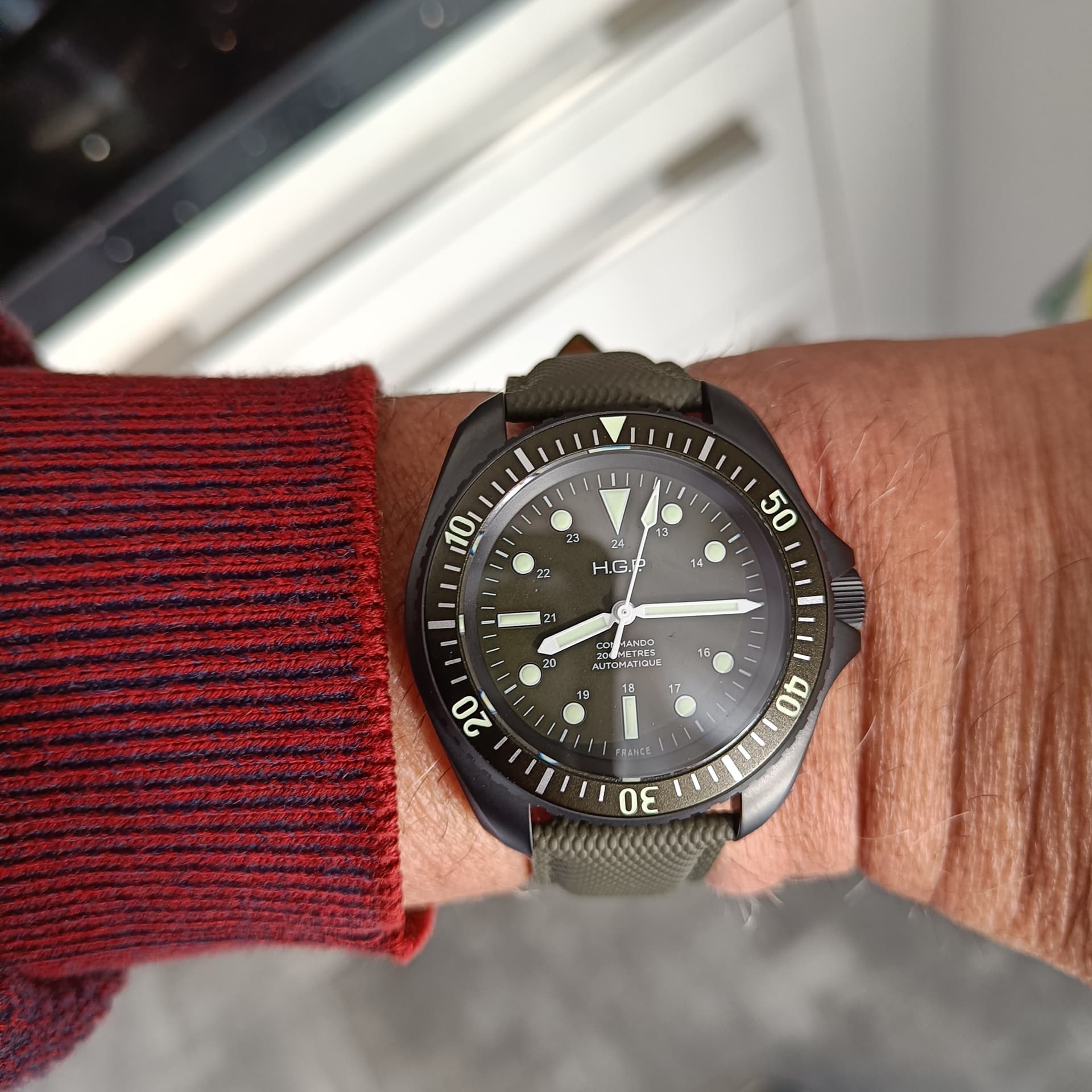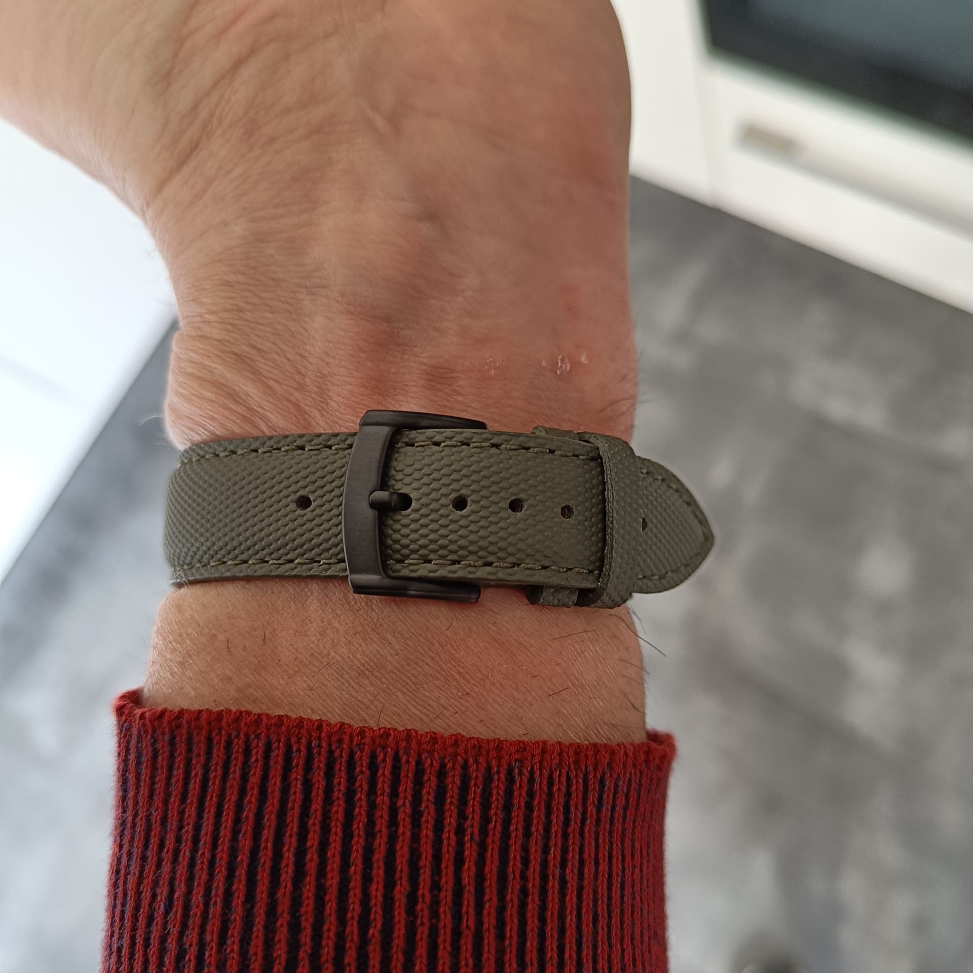 Als je wilt krijg je gratis de groene sailcloth strap met upgrade black buckle erbij