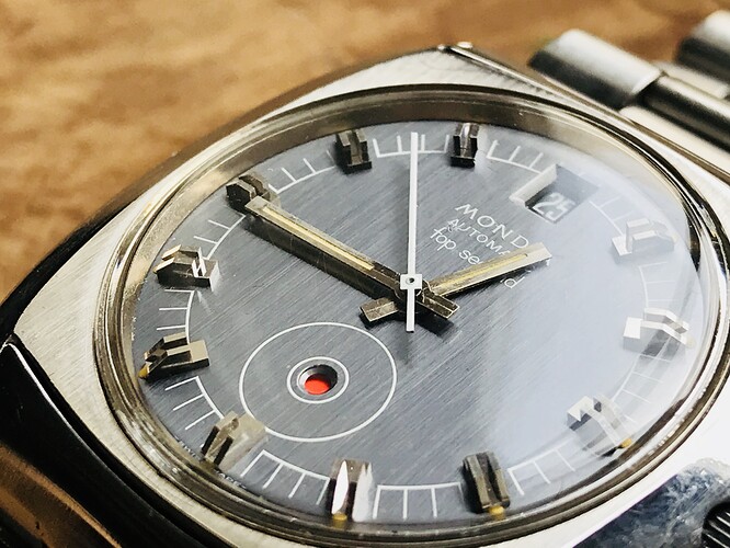 Toen ik dit horloge zag wist ik gelijk, dit is iets bijzonders. Terwijl je dat bijzondere eigenlijk alleen kan zien in bewegend beeld maar daarover later meer. Een erg mooi horloge, volledig origineel, een prachtige geborstelde frijze dial en mooie gefaceteerde kast en geïntegreerde band met de prachtigste endlinks die ik in tijden heb gezien. Clasp gesigneerd met ‘Mondial’ en alleen de kroon had geen logo. Dat moet een reden hebben want nergens op het horloge heb ik het kenmerkende beeldmerk van Mondia kunnen vinden. Afijn, dat gebeurde vaker met horloges uit de jaren zeventig.