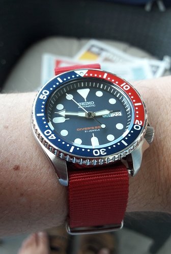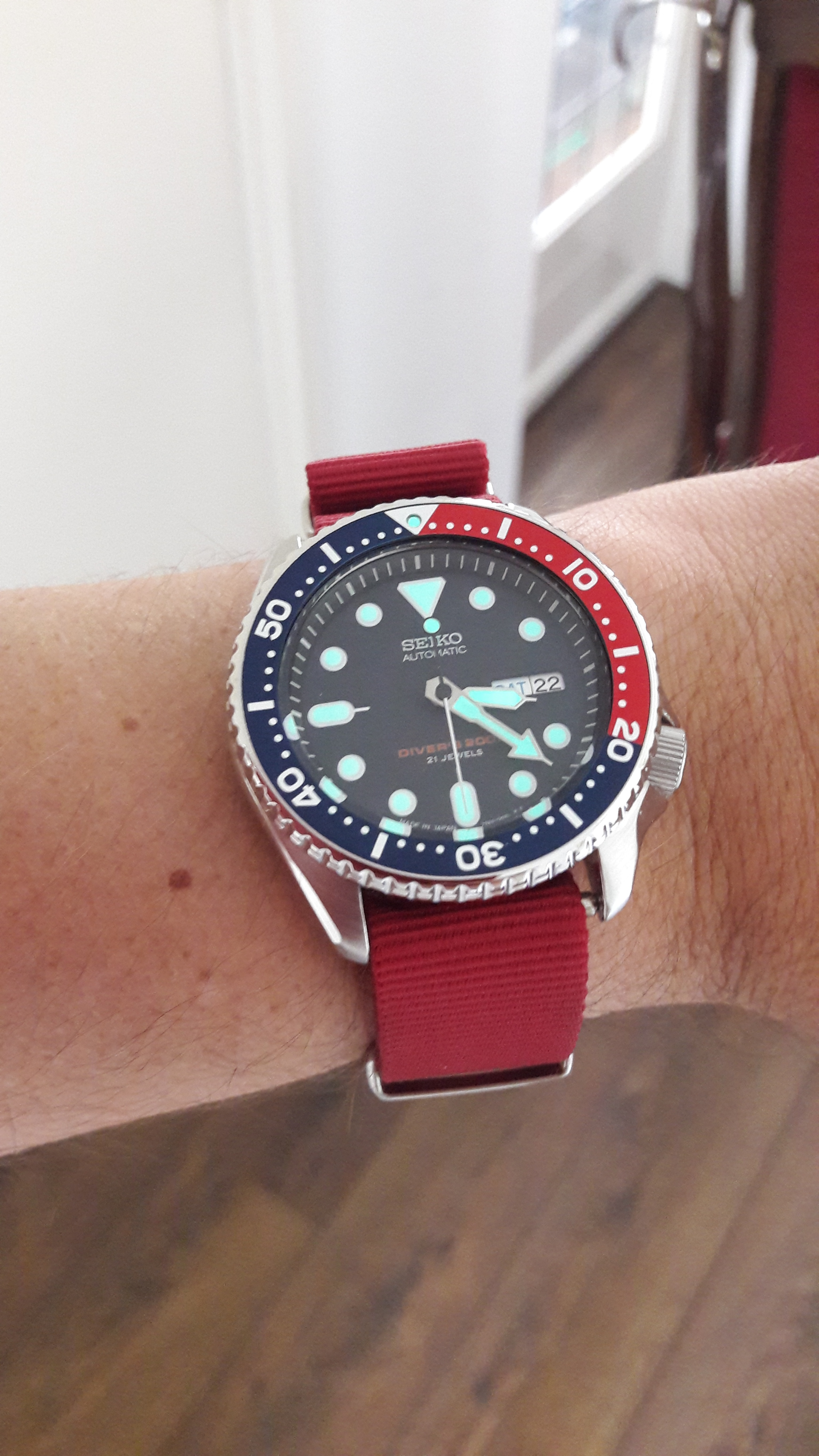 Aangezien mijn nieuwe bandjes (besteld bij CheapestNatoStraps) niet op tijd zijn geleverd moet ik het met dit -te smalle oude(!) 20mm- Nato bandje doen…