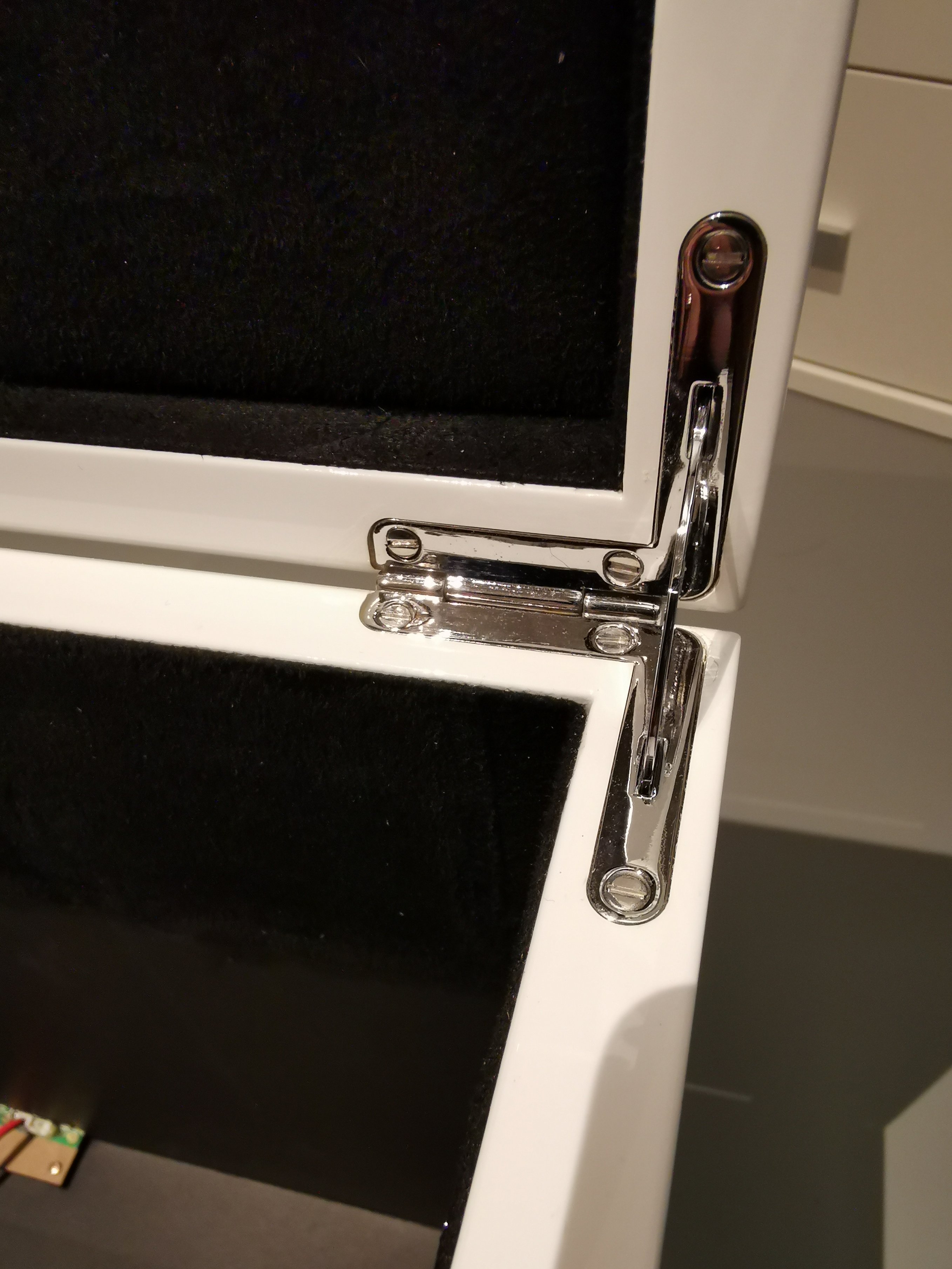 Lak op de kast is heel netjes, meerdere lagen lak en afgewerkt met hoogglans blanke lak. Ik heb geen imperfecties kunnen vinden verder. Aan de achterkant een usb aansluiting, ideaal voor mijn Smartwatch op te laden.