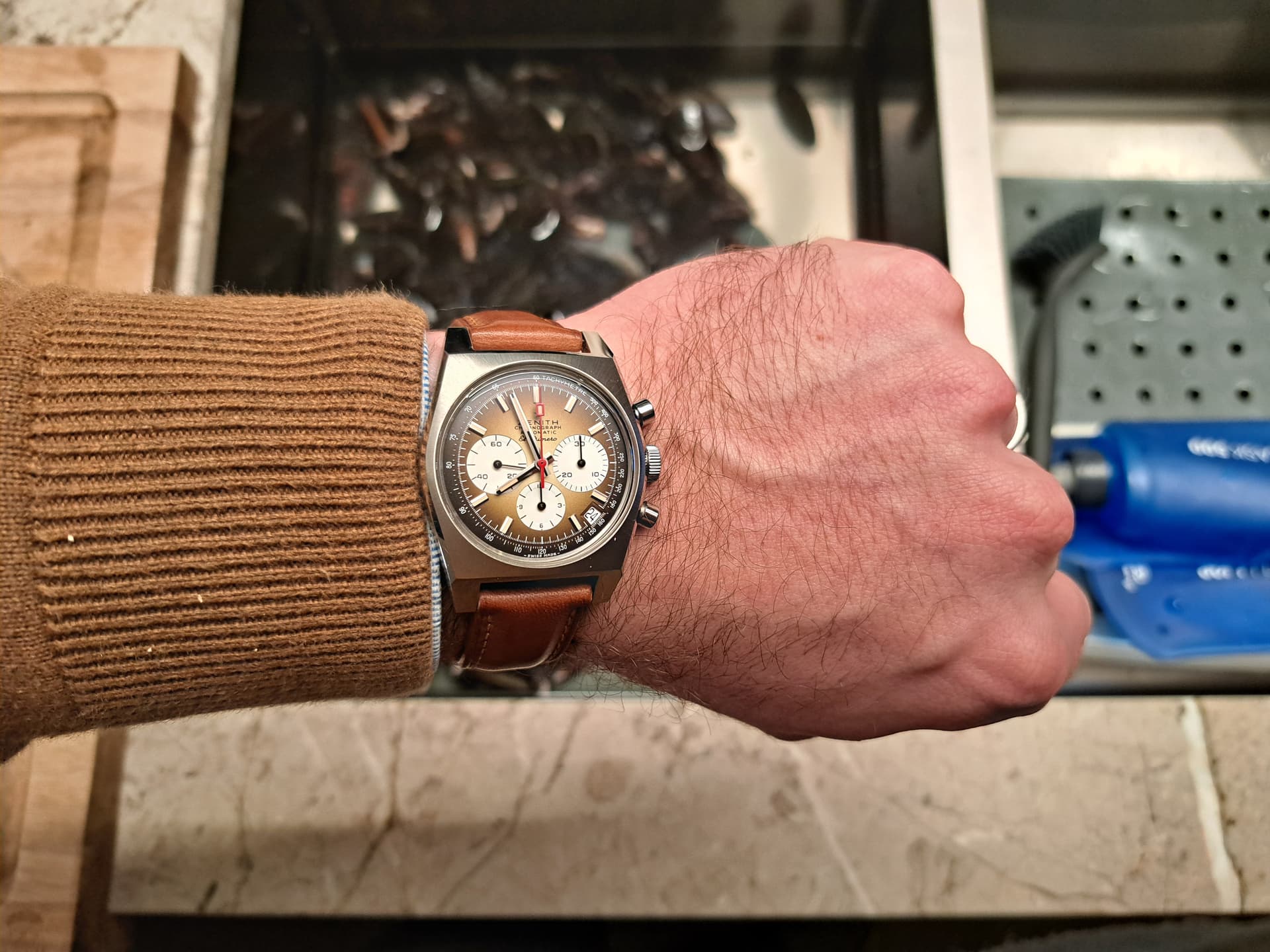 Mijn eerste sub-40mm was geboren uit noodzaak. Ik had een horloge met een ETA7754, schitterend uurwerk maar de kast was in het echt zum kotzen. Echt, walgelijk. Moest dus een andere kast vinden met wijzerplaat die paste en dat werd een 29mm plaat in een 38mm kast. Eigenlijk de Tutima 793 kast. Maar dat droeg zo makkelijk, licht, compact en toch compleet, dat paar maanden later er een 38mm Eberhard volgde, een 40mm IWC, 41mm Porsche Design, en uiteindelijk, een 37mm Revue Thommen. Ik kwam van de 51mm Oris Prodiver… Draag die laatste nog steeds regelmatig maar die kleintjes, boy oh boy wat prettig en tof en cool.