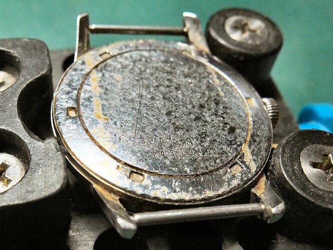 Het kastje was letterlijk rondom aangekoekt met vuiligheid; het glas was reddeloos verloren met lijmresten aan de rand en een dikke barst en de caseback had ernstig te lijden gehad door het waarschijnlijk jarenlang dragen op een nooit schoongemaakt perlon bandje. Het bewuste bandje zat er gelukkig niet meer bij. Ik moet er niet aan denken hoe dat er uit gezien zou hebben. Bah!