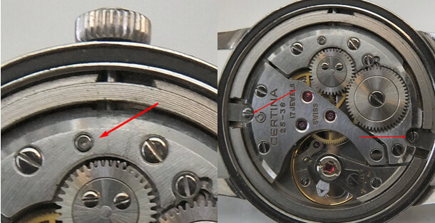 Dan moet de kroon met het asje er uit om het uurwerkje uit de kast te kunnen nemen. Gelukkig is dit cal. 25-36 werkje voorzien van een drukpalletje in plaats van het beruchte tiretteschroefje. Verrassend modern voor een horloge uit 1964. Die schroefjes zijn namelijk een ramp. Je moet ze soms meer, soms minder dan 1 à 2 slagen losdraaien om de tigue (het opwindasje) er uit te kunnen trekken. Draai je het schroefje te ver los, valt het tirette plaatje er af en dan moeten de wijzers, de wijzerplaat en als je pech hebt ook het (dag)datum mechaniek er af om dat plaatje weer vast te zetten. Maar gelukkig is dat hier makkelijk. Met één hand m.b.v. een klein pinnetje het palletje indrukken en met de andere hand het kroontje met asje er uit trekken. Bij wat eenvoudiger geconstrueerde horloges ligt er dan een losse spacerring om het uurwerk heen met nokjes aan de kant van de caseback zodat het uurwerk als de caseback is dichtgeschroefd vastgeklemd wordt. Bij deze Certina zit het wat mooier: het uurwerk in de kast is gefixeerd met behulp van twee kleine beugeltjes en schroefjes die het werkje in een rand van de spacer ring vast klemmen. Schroefjes en beugeltjes gaan er uit. Het uurwerkje ligt nu los en kan zo kan zo uit het kastje getild worden.
