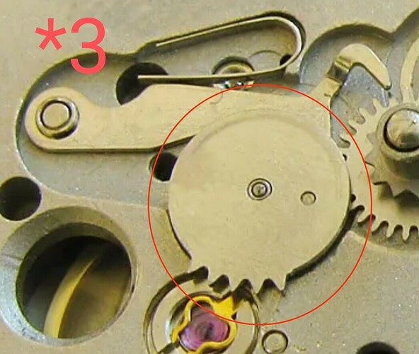 Het is dus een dubbel rad. Aan de onderkant van dit asymmetrische rad, zit de aansluiting op het minutenrad. Het wordt dus door het minuten rad aangedreven en sluit vervolgens aan op het 12 vingerige rad, via het asymmetrische rad dat goed zichtbaar is.