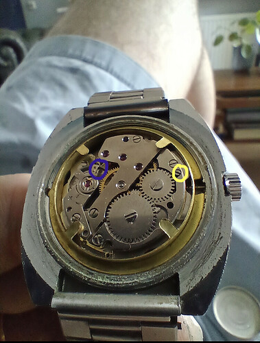 Uurwerk kan uit de kast door het geel omcirkelde schroefje 1 of 2 slagen los te draaien en de kroon eruit te trekken.