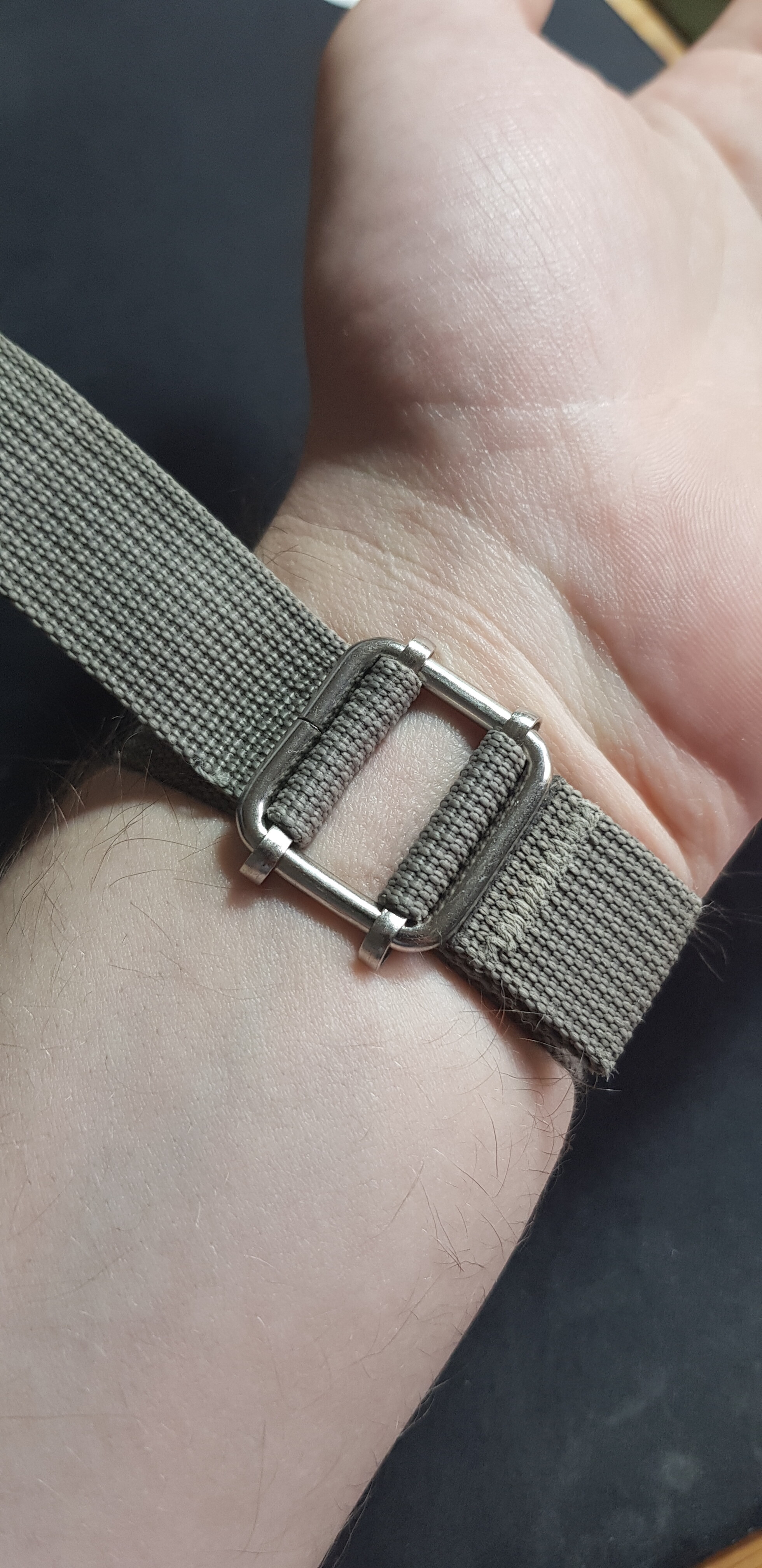En nog een snelle simpele creatie. Een stuk band van een backack en een aangepaste schuif gesp; komt geen stiksel aan te pas! Is een beetje in dezelfde geest als het ontstaan van nato of MN straps