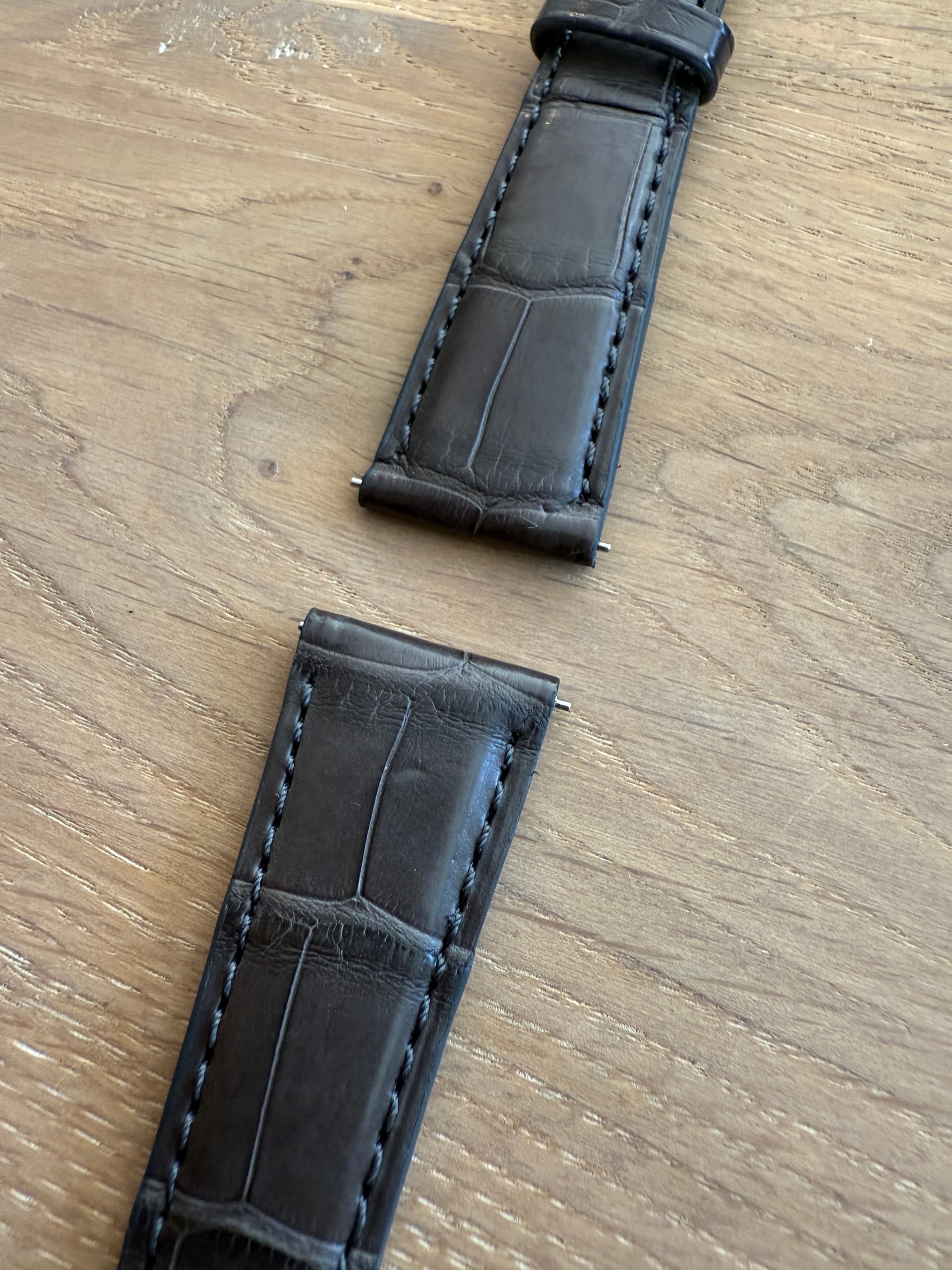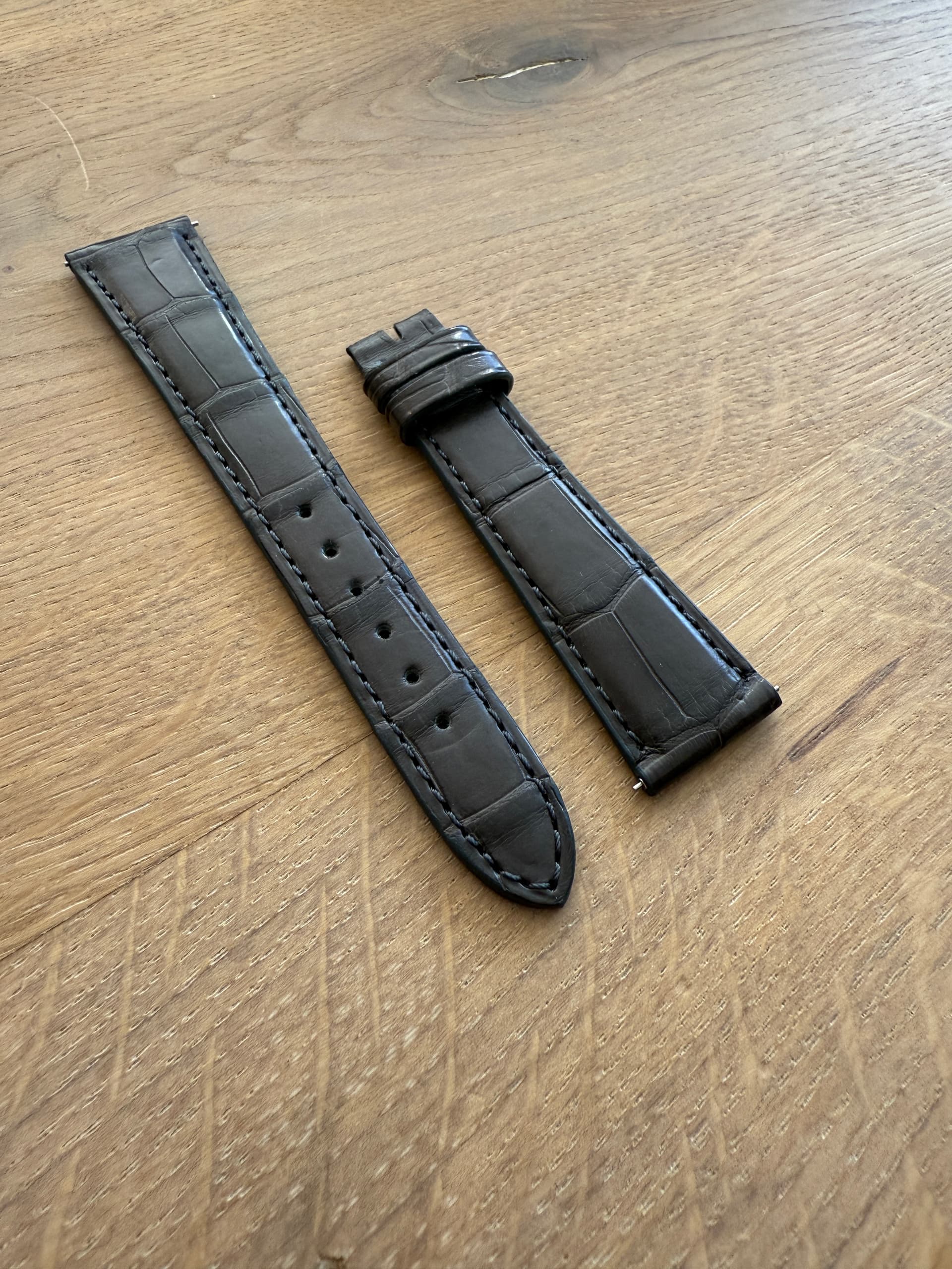 Exclusief horlogebandje van LIC Leather (de bandenmaker van o.a. AP en FP Journe). Het bandje is gemaakt van echt donker grijs alligator leer met een alligator voering. De maat is 19/14mm, en 75/115mm lang. Komt inclusief quick release pennen. Het bandje is ongebruikt.