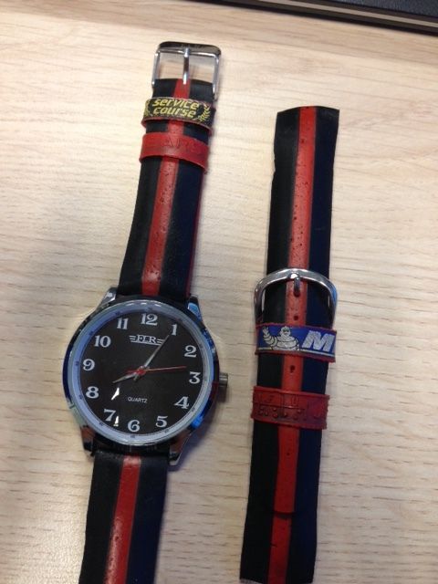 Ik ben benieuwd naar jullie reactie heb van een oude fietsband horlogenbandjes gemaakt en ook de tekst aan de zijkant gebruikt Met name het Michelin bandje vond ik wel leuk.