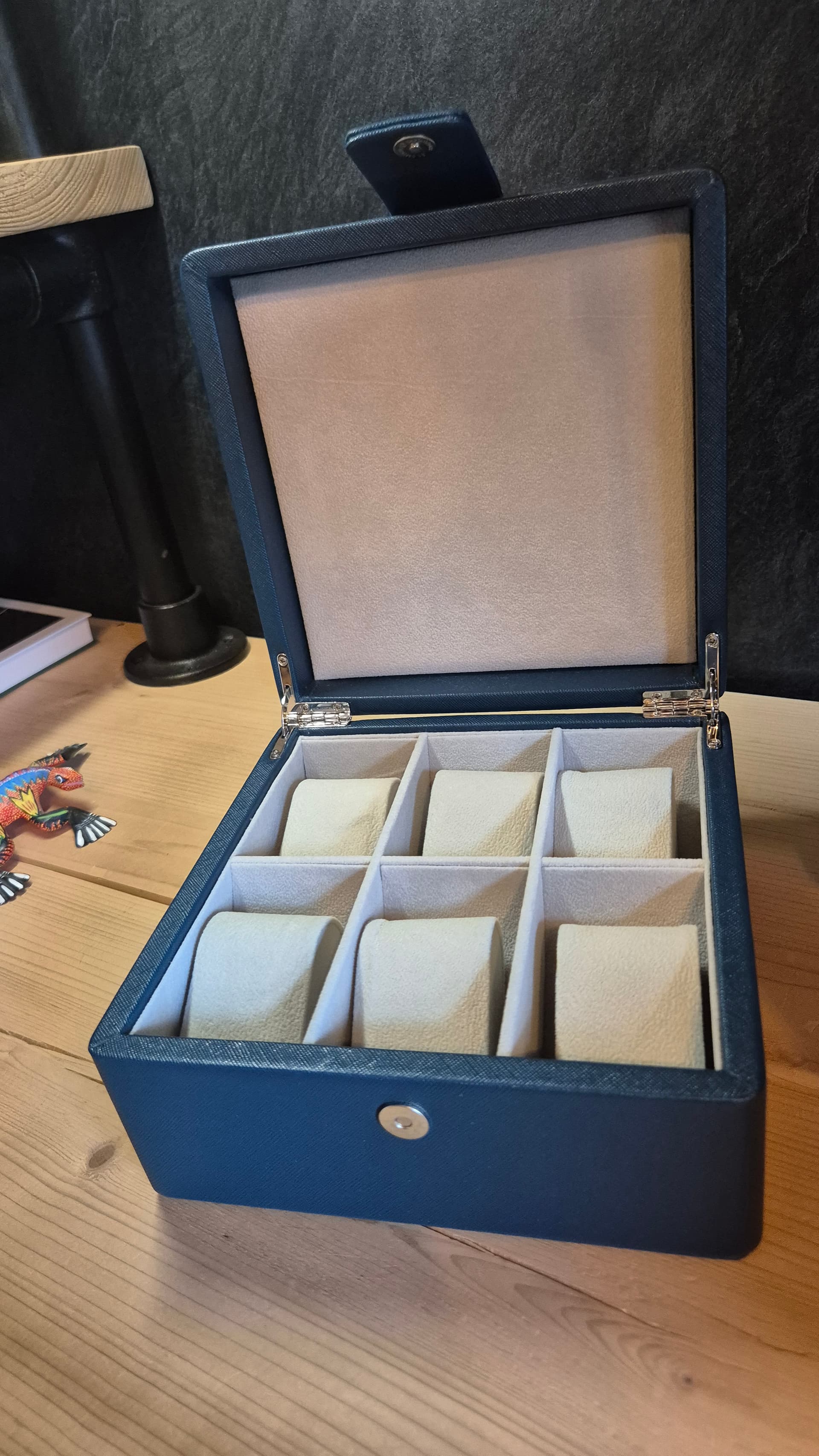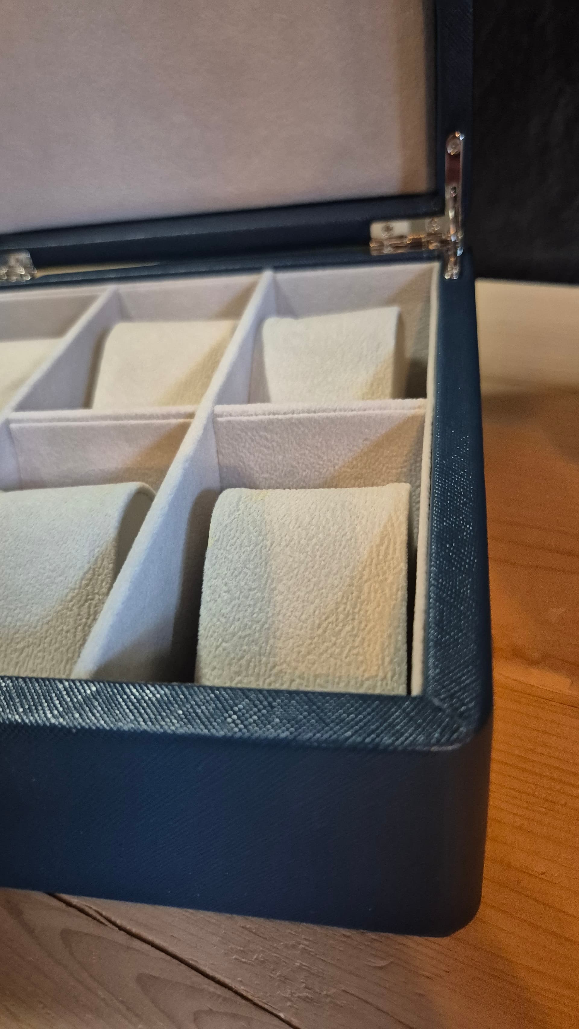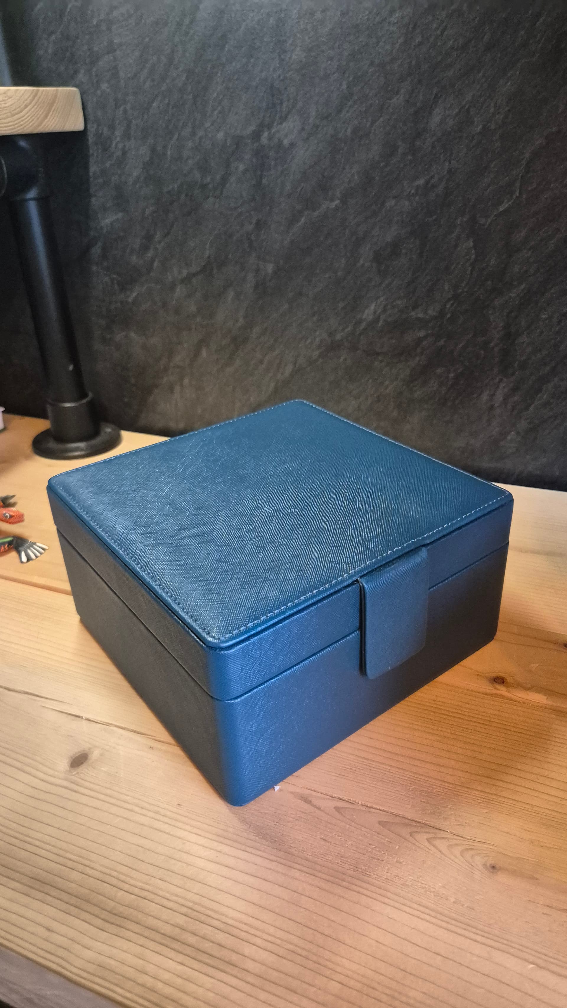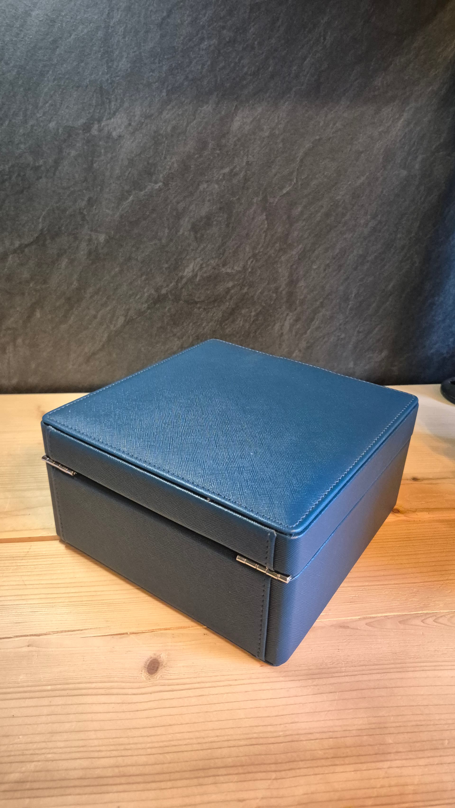 Hierbij verkoop ik m’n horlogedoos. Hij is nog in mooie staat en onbeschadigd. Biedt plek aan 6 horloges en is gemaakt van blauw kunstleder met een mooie structuur.