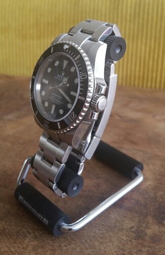 Ik had wat plaatjes laten zien van houders die ik wel interessant en stijlvol vond en die waarschijnlijk ook wat geschikter waren voor horloges met wat kortere banden i.v.m. mijn smallere polsen. En dan blijkt maar weer hoe leuk dit forum is, want prompt kreeg ik een mail van Merl dat hij een aantal houders had besteld die in mijn lijstje stonden en hij wel wat wilde doorverkopen. Meteen toegehapt en vandaag kon ik ze bewonderen en meteen uitproberen op o.a. de Datejust die een beurtje had gehad. Ik vind ze schitterend!