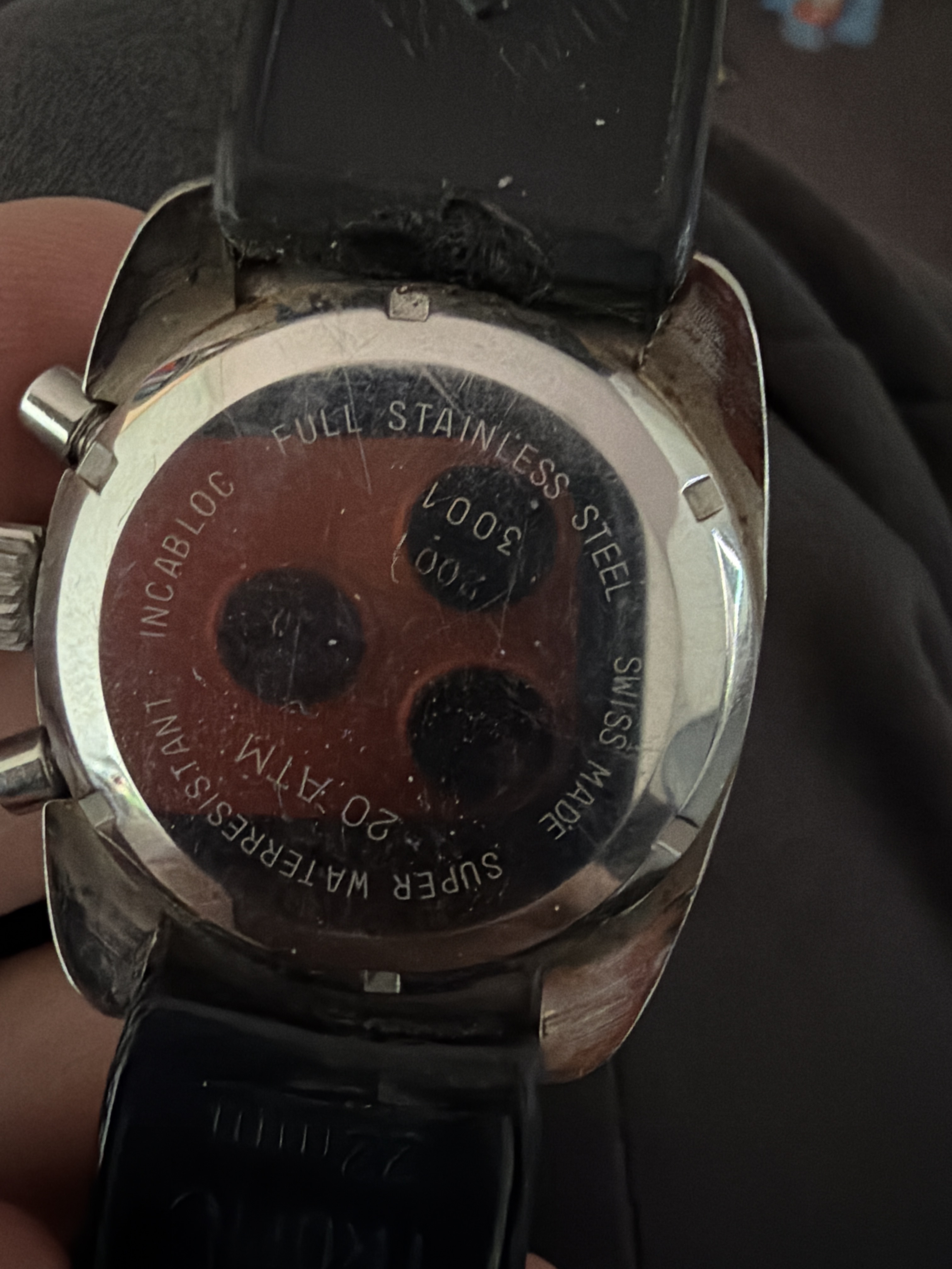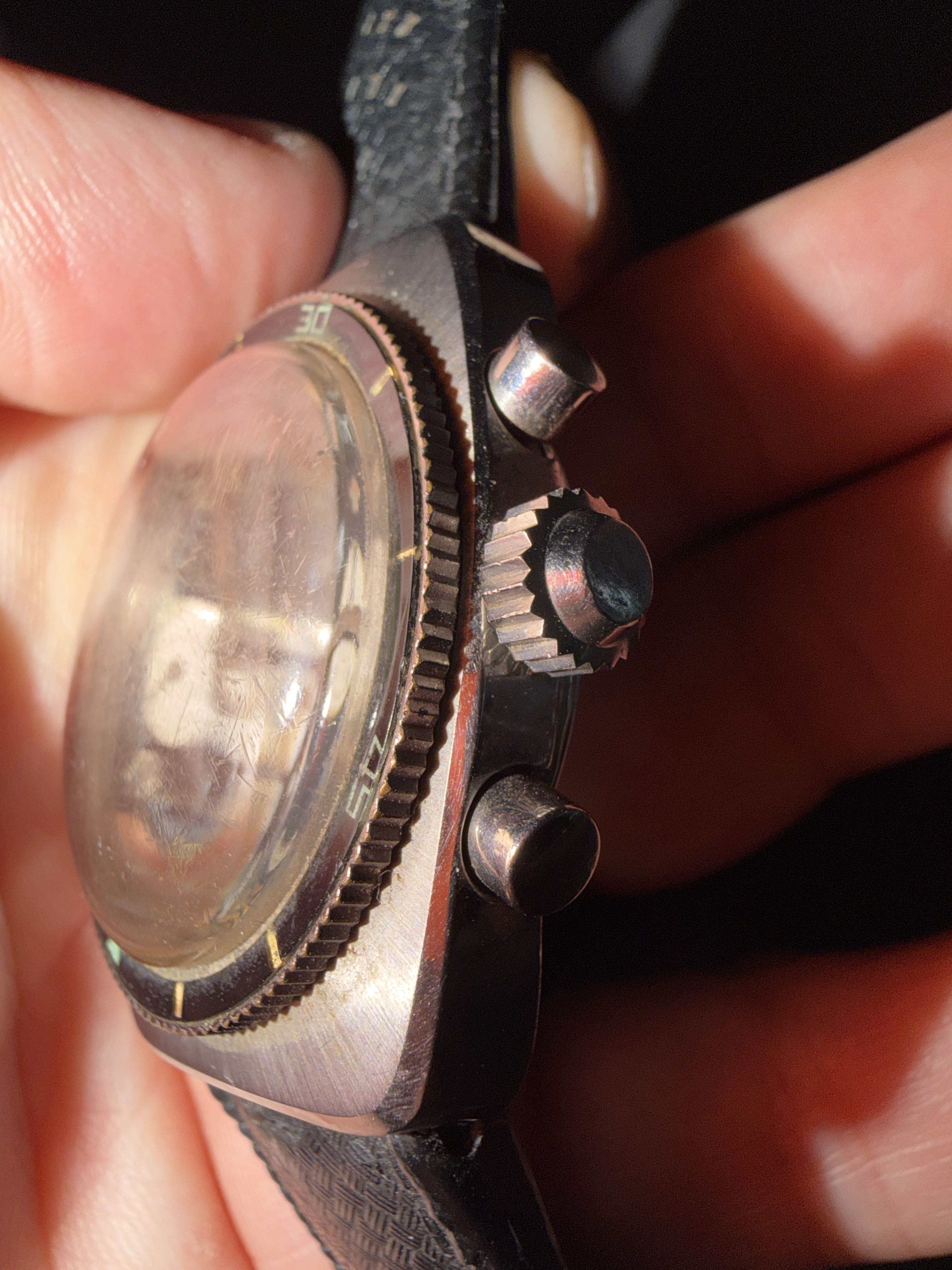 Pakkingen zijn niet top zo te zien. De rand van de wijzerplaat ten hoogte van de minute track (tussen 3 en 6) is verkleurd naar bruin. Ik hoop dat dit niet duid op waterschade.