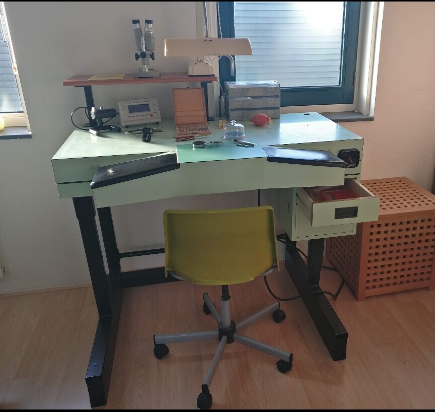 Ik heb deze tafel al een tijdje, overgenomen van een horlogemaker. Bevalt me echt uitstekend. De tafel heeft vaste armsteunen.