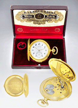 Dit horloge lijkt me niet iets wat hij zelf gekocht/gedragen heeft. Hooguit een relatiegeschenk dat ergens in een laadje heeft gelegen. Zelf gaf hij als kerstcadeautjes wel eens Lange’s weg maar dat waren altijd zakhorloges. Ik heb nergens gelezen dat hij zelf überhaupt een horloge droeg.