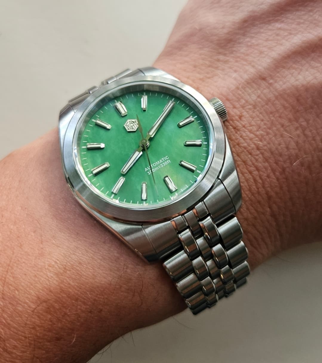 Vandaag even extra schakels tussen gezet en kan om de pols. Even wennen aan de afmeting (46mm gewend), maar over de kwalitiet ben in te spreken (prijs in ogenschouw nemend).