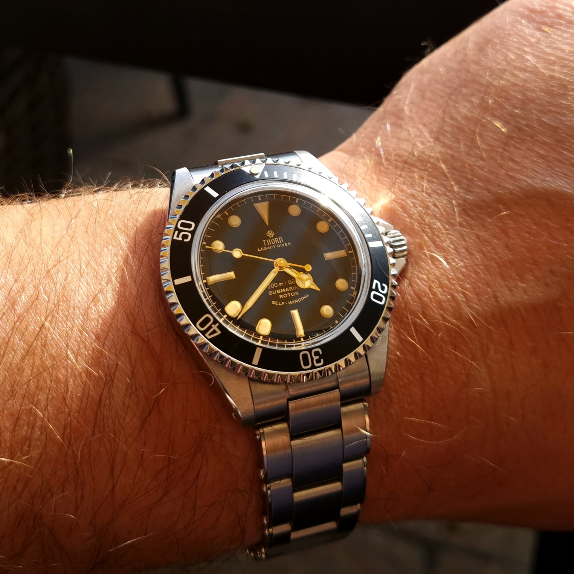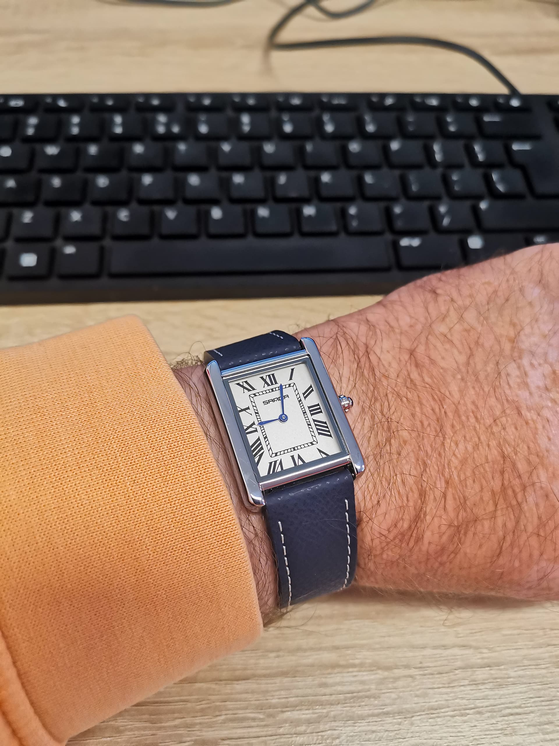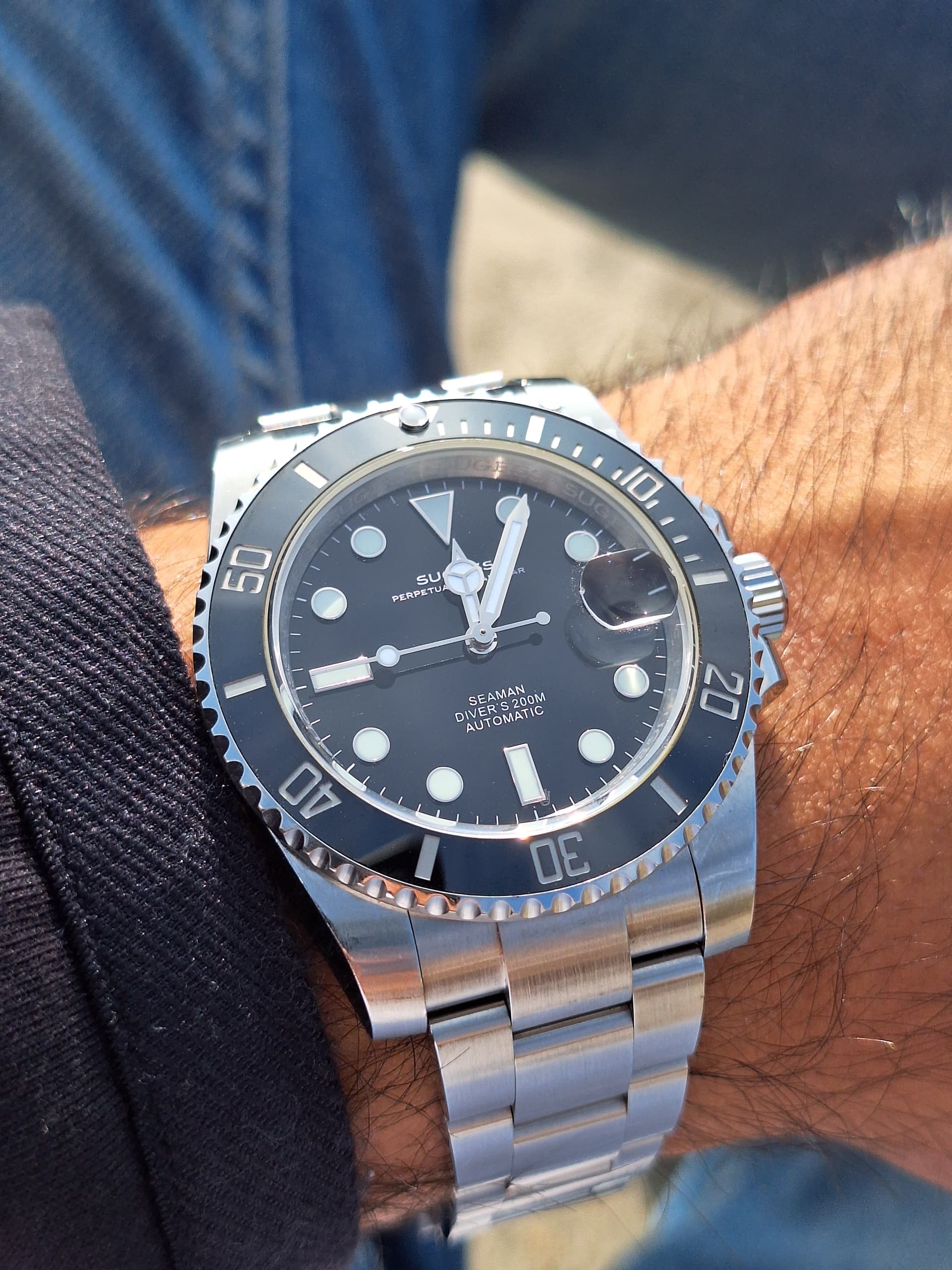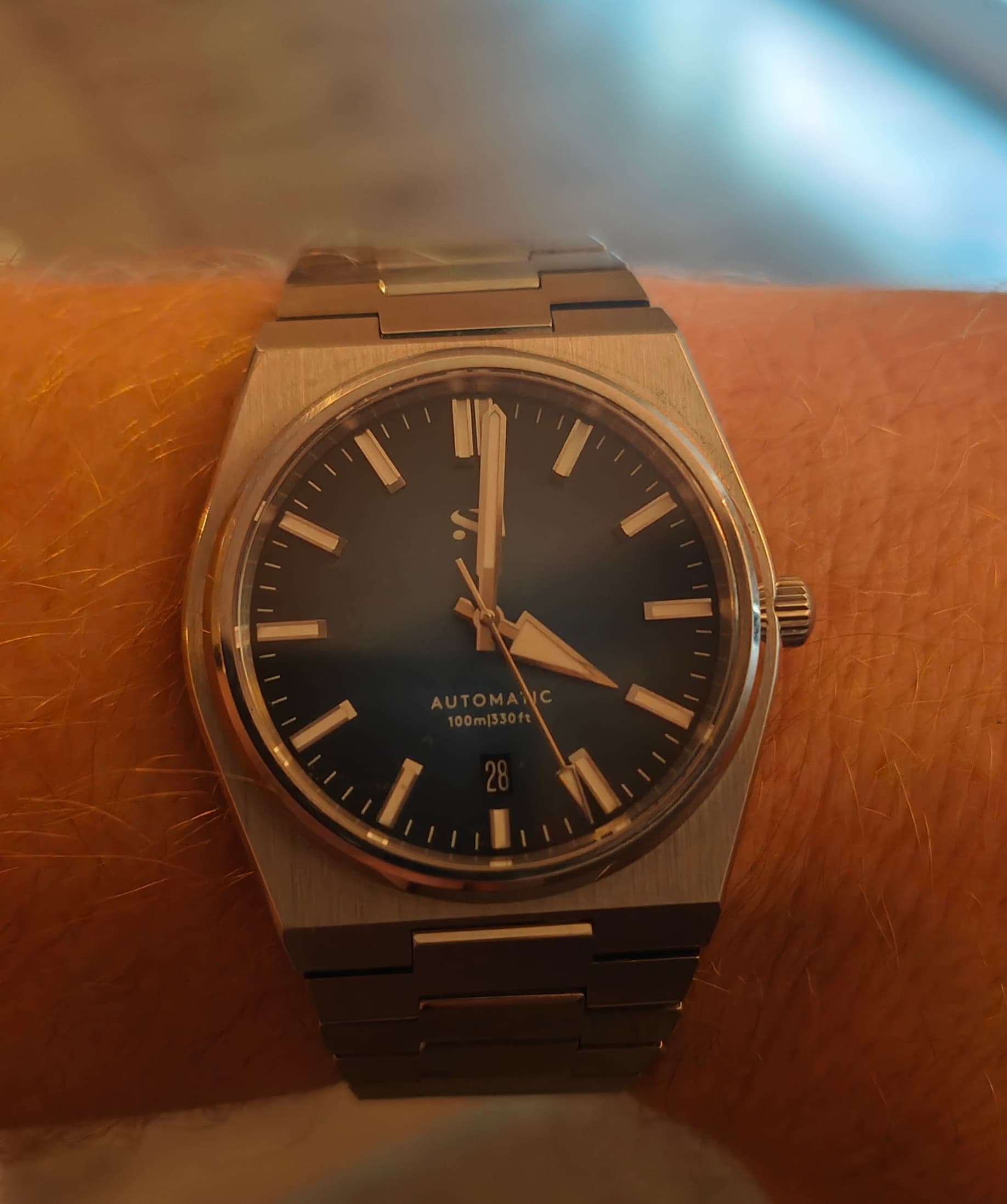 Dank je! Ik weet zelf eigenlijk nog niet of ik hem echt mooi vind. Maar wel super makkelijk af te lezen, quartz dus geen gedoe, saffier, waterdicht tot 100 meter (zeggen ze) en zo goedkoop dat als er iets mee gebeurt dat ook niet meteen een ramp is. Wat ook fijn is: De afstand tussen de springbars en de kast is lekker groot dus ook een eventueel dikke Nato kan er makkelijk op.