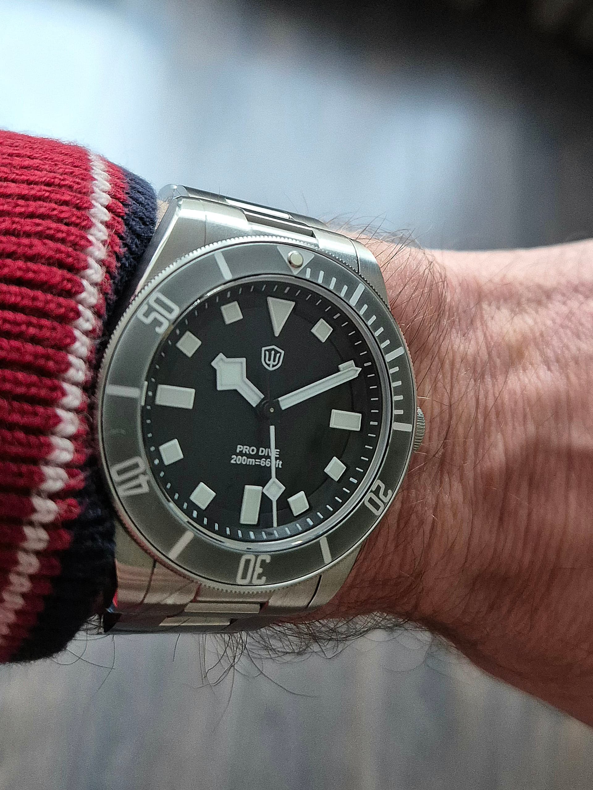 Precies! Wolbrook wordt er tegenwoordig vaak van beschuldigd een SeaQ homage te zijn, maar (het oorspronkelijke) Wolbrook bracht dit soort horloges met zo’n plaat al vanaf 1960 uit, terwijl de SeaQ volgens GO gebaseerd zou zijn op een in zeer kleine oplage uit 1969 voor een Oost-Duitse militaire eenheid.