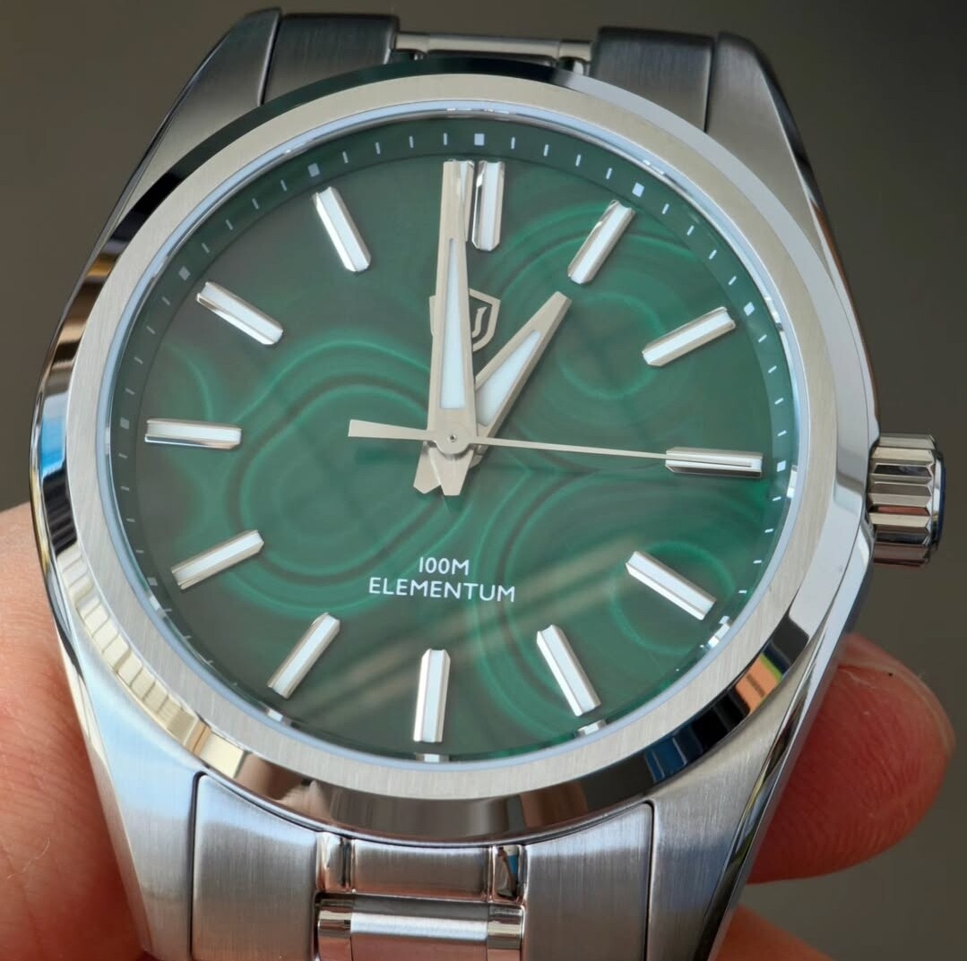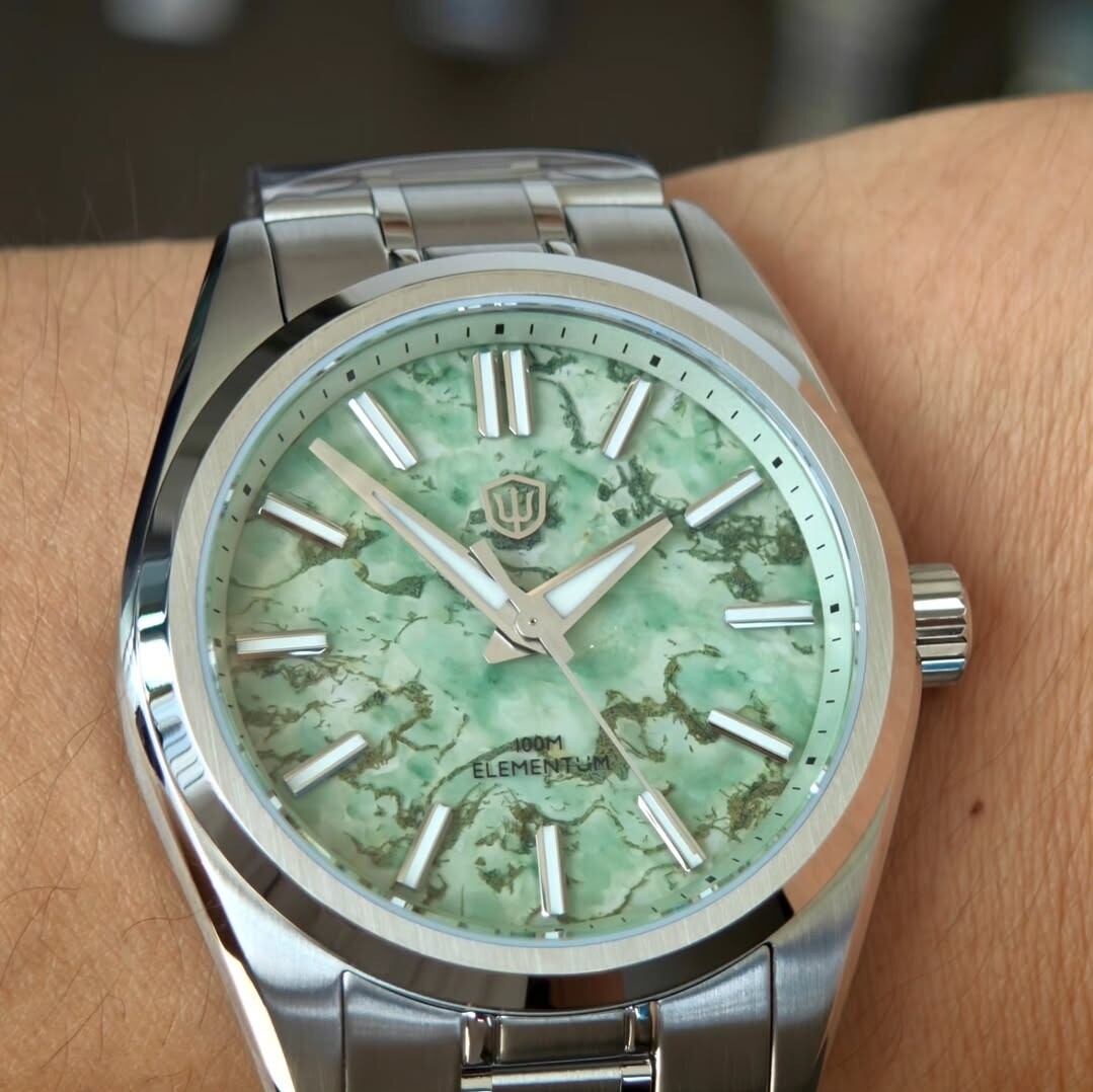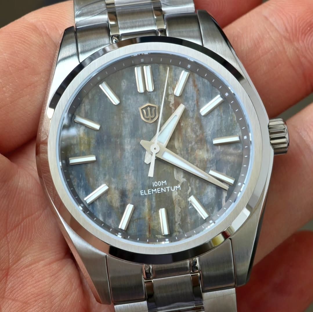 We hebben de afgelopen maanden doorgebracht met allerlei natuurstenen te experimenteren elke wijzerplaat is geslepen, gepolijst en met de hand gemonteerd. Onder het licht ziet elk stuk er helemaal anders uit.