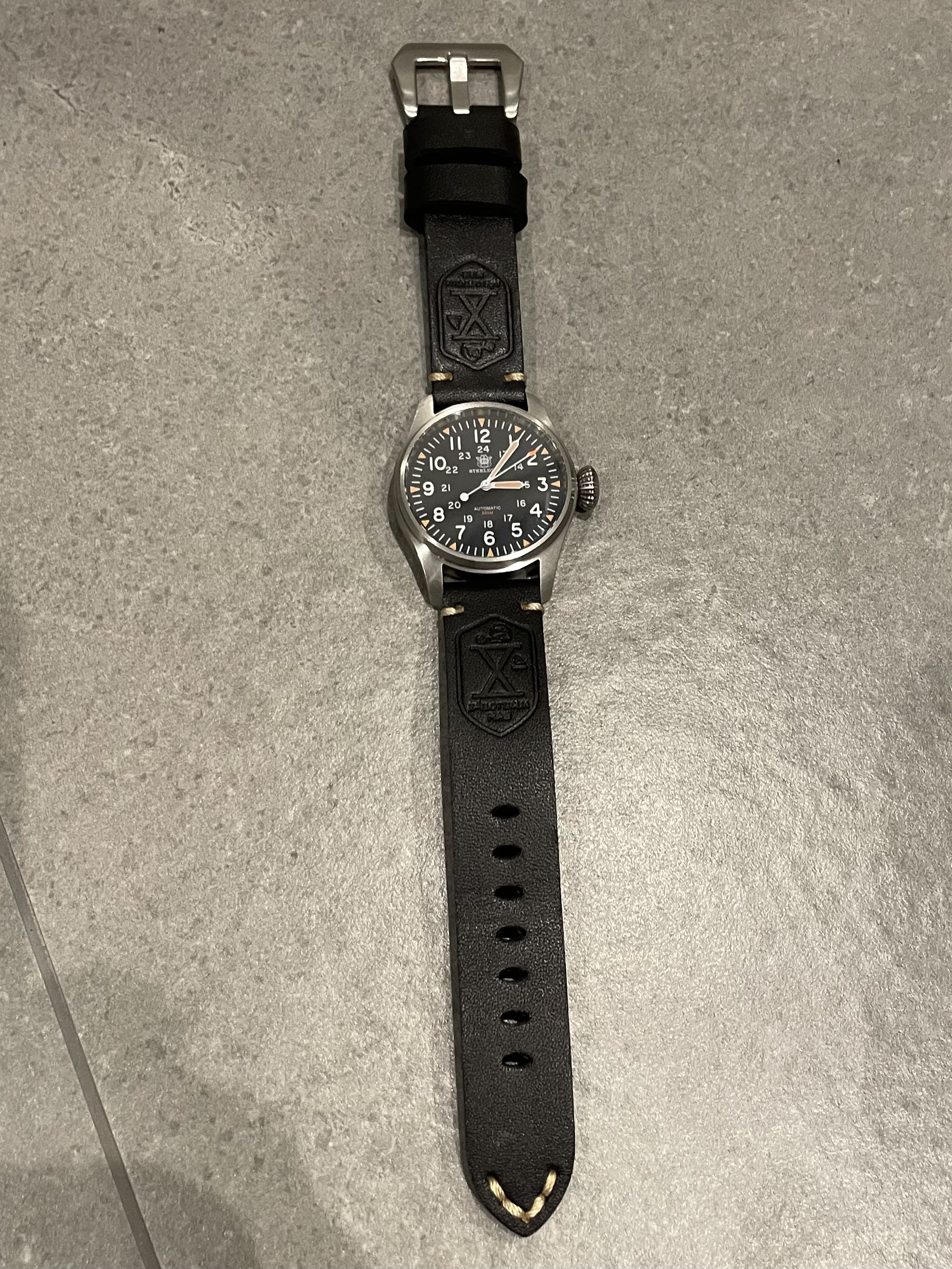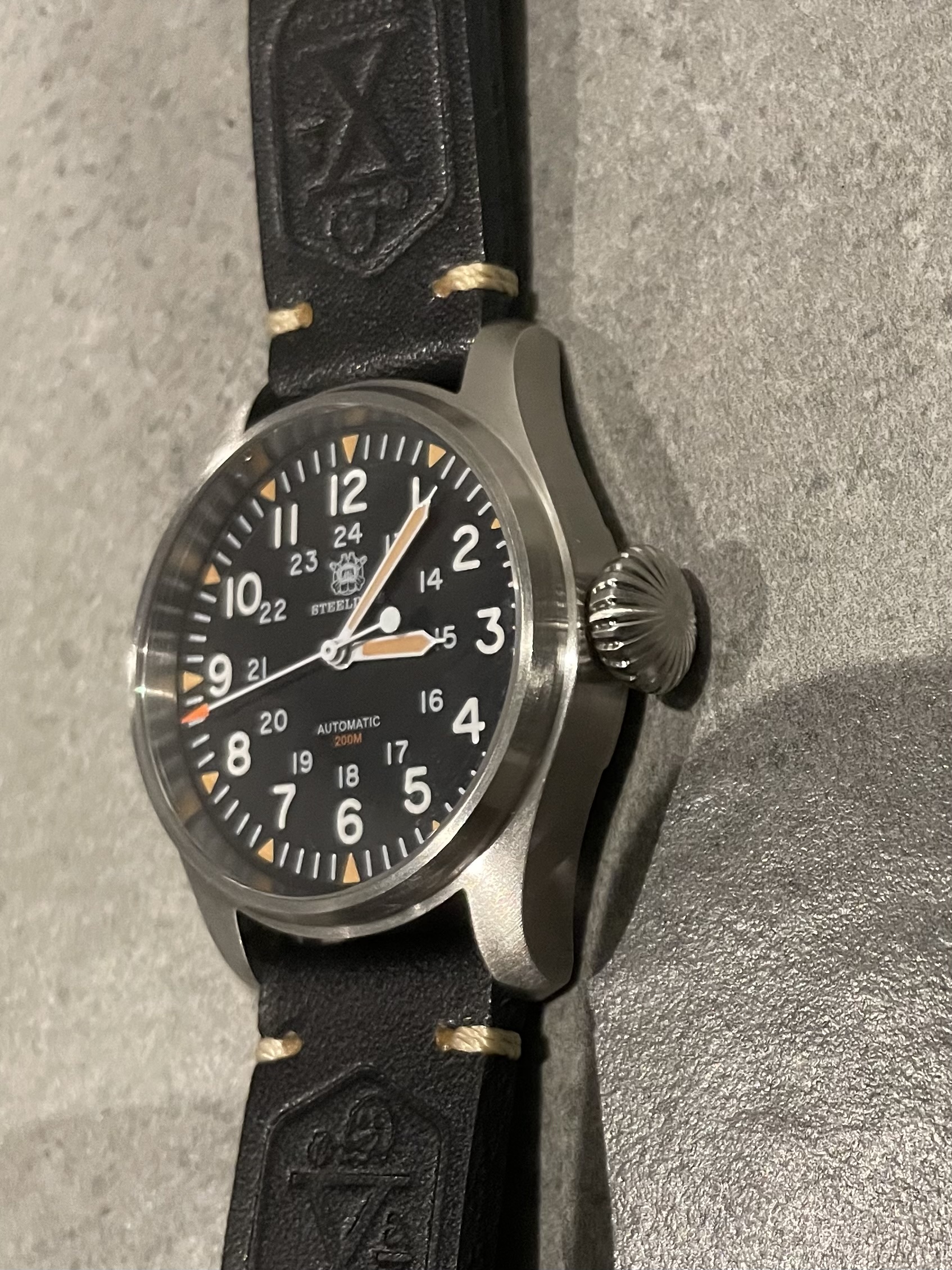 Langzamerhand druppelen ze binnen. Nu een Steeldive, welke ik meteen op een zwarte leren band heb gezet.
