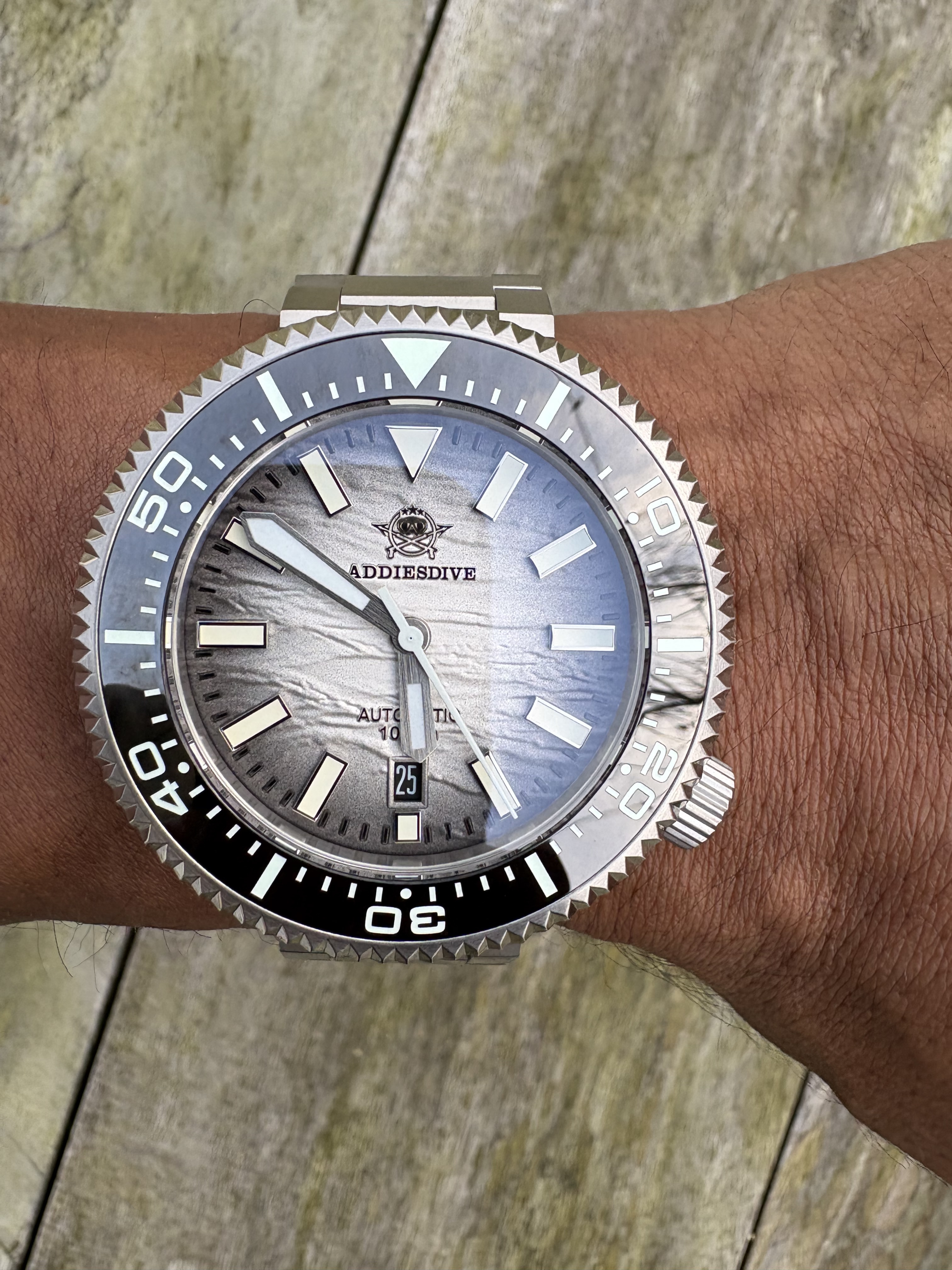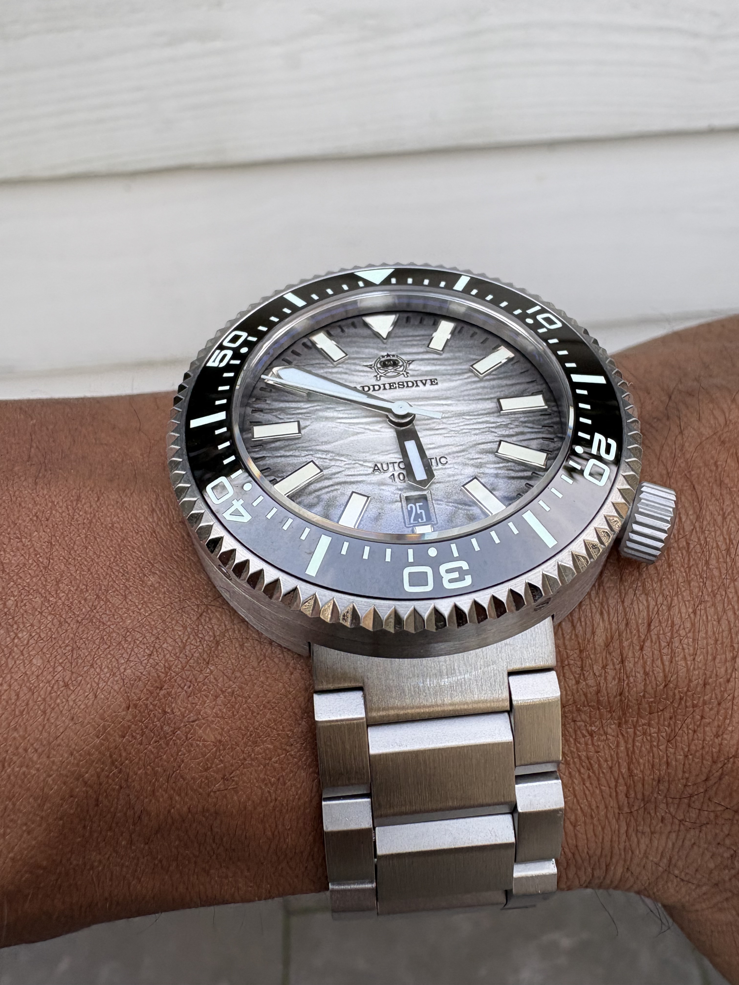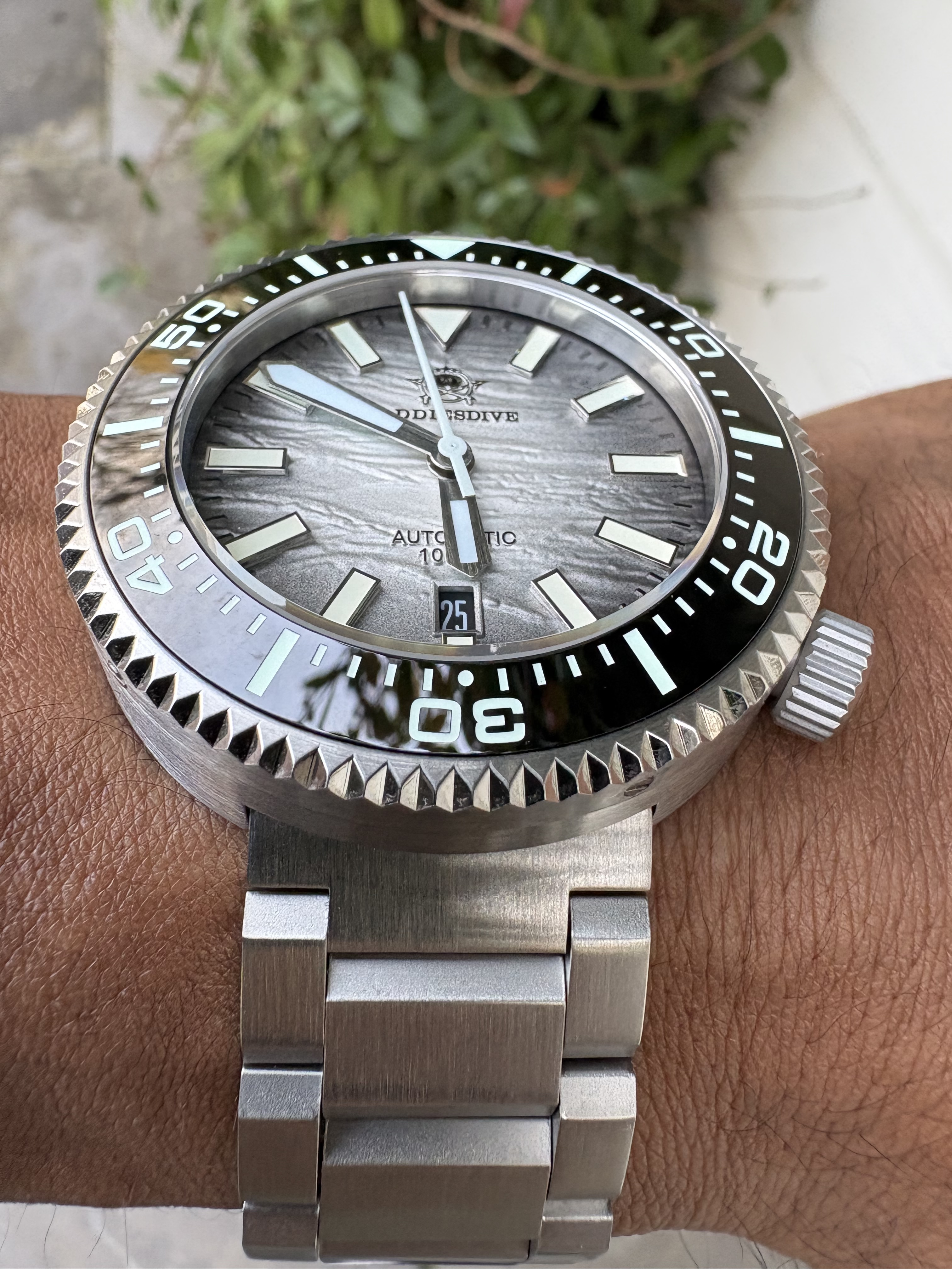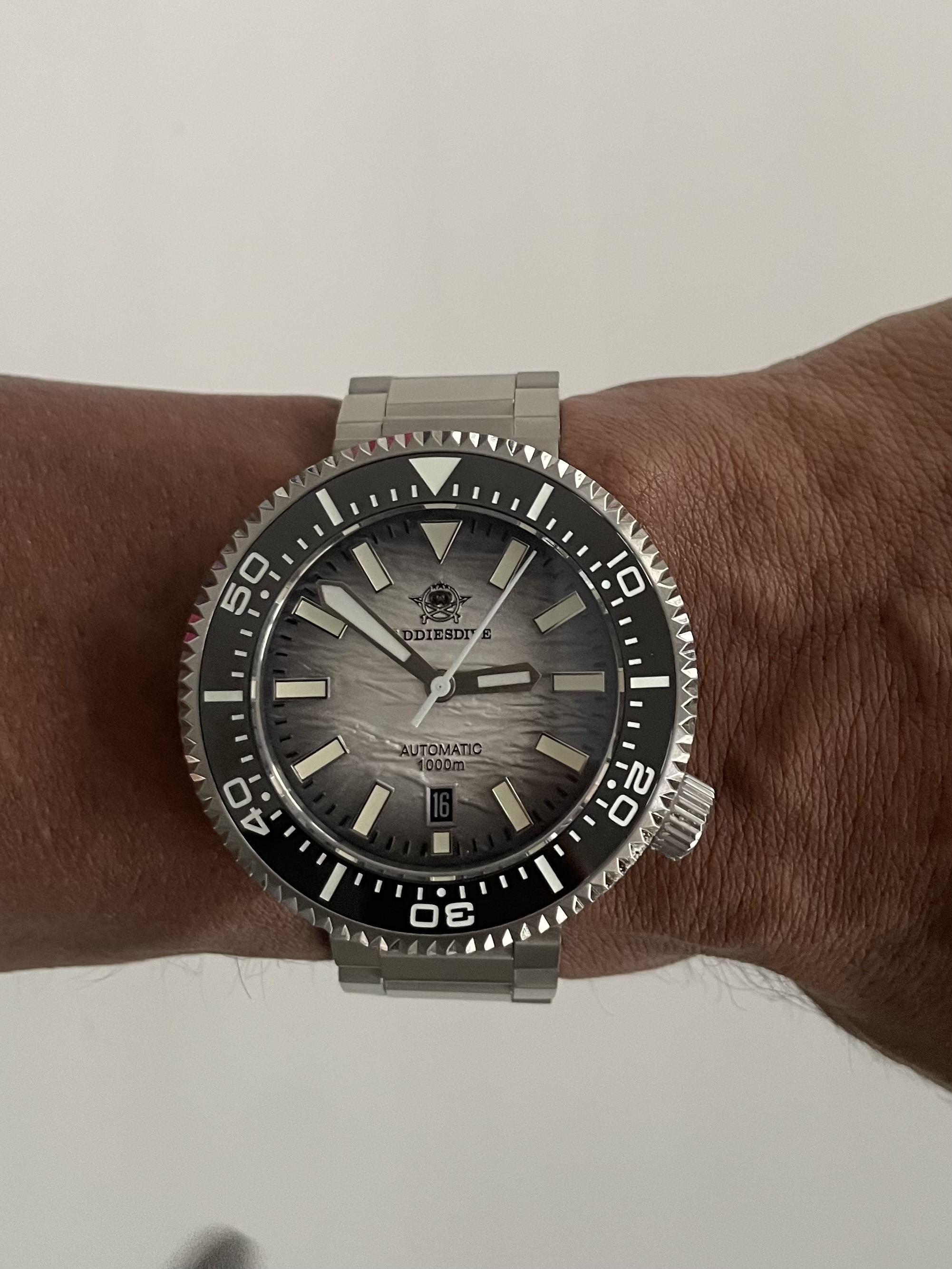 Klopt helemaal. Ik ben de laatste tijd weer helemaal fan van wat grotere duikers! Heb nog een foto erbij gedaan kun je zien hoe die op mijn pols zit. Ruimte genoeg ![]()