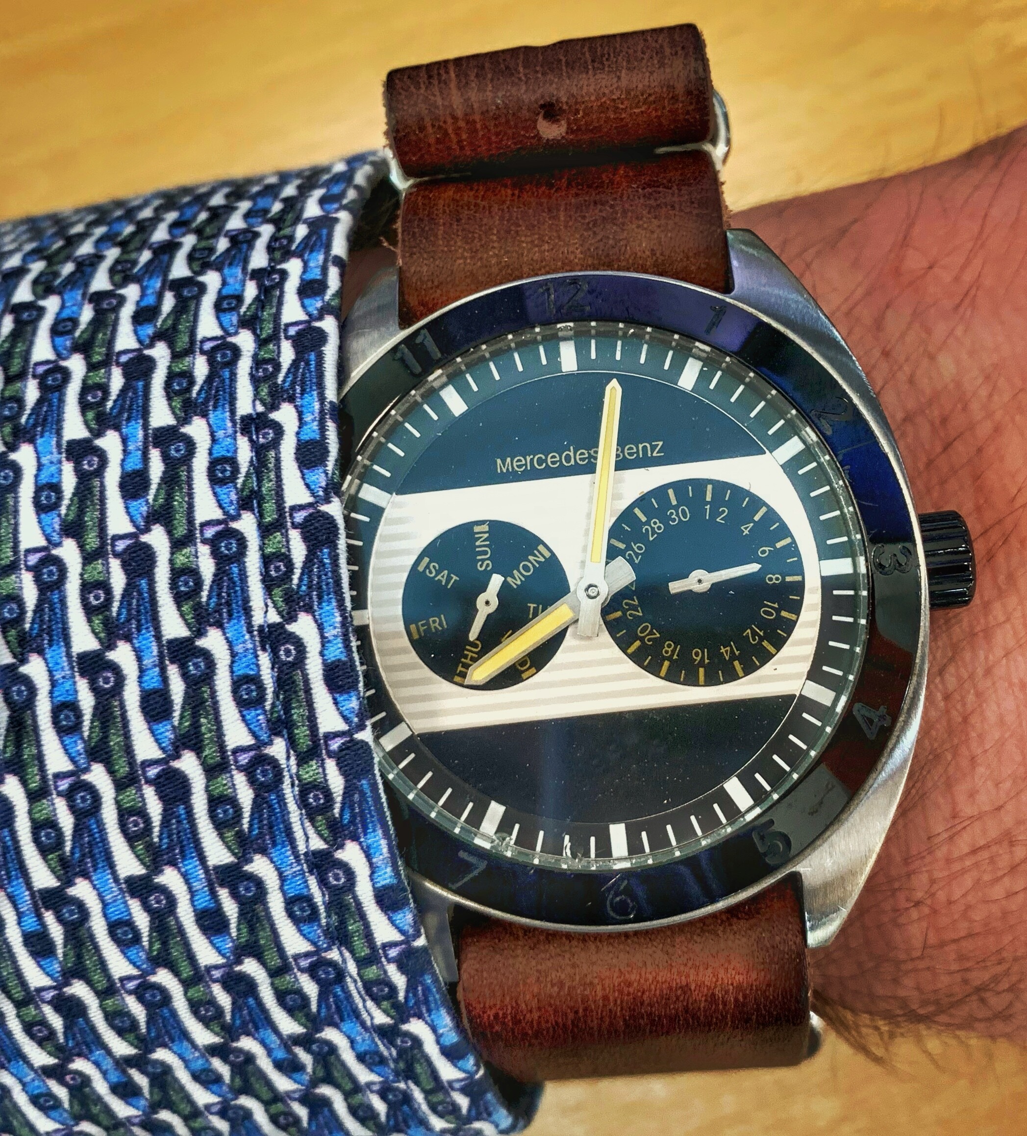 Ik heb deze alweer een hele tijd. Altijd een geinig klokje gevonden met een wijzerplaat met een knipoog naar de koplamp van een W123. Laatst de boel geüpgraded met een leren Nato.