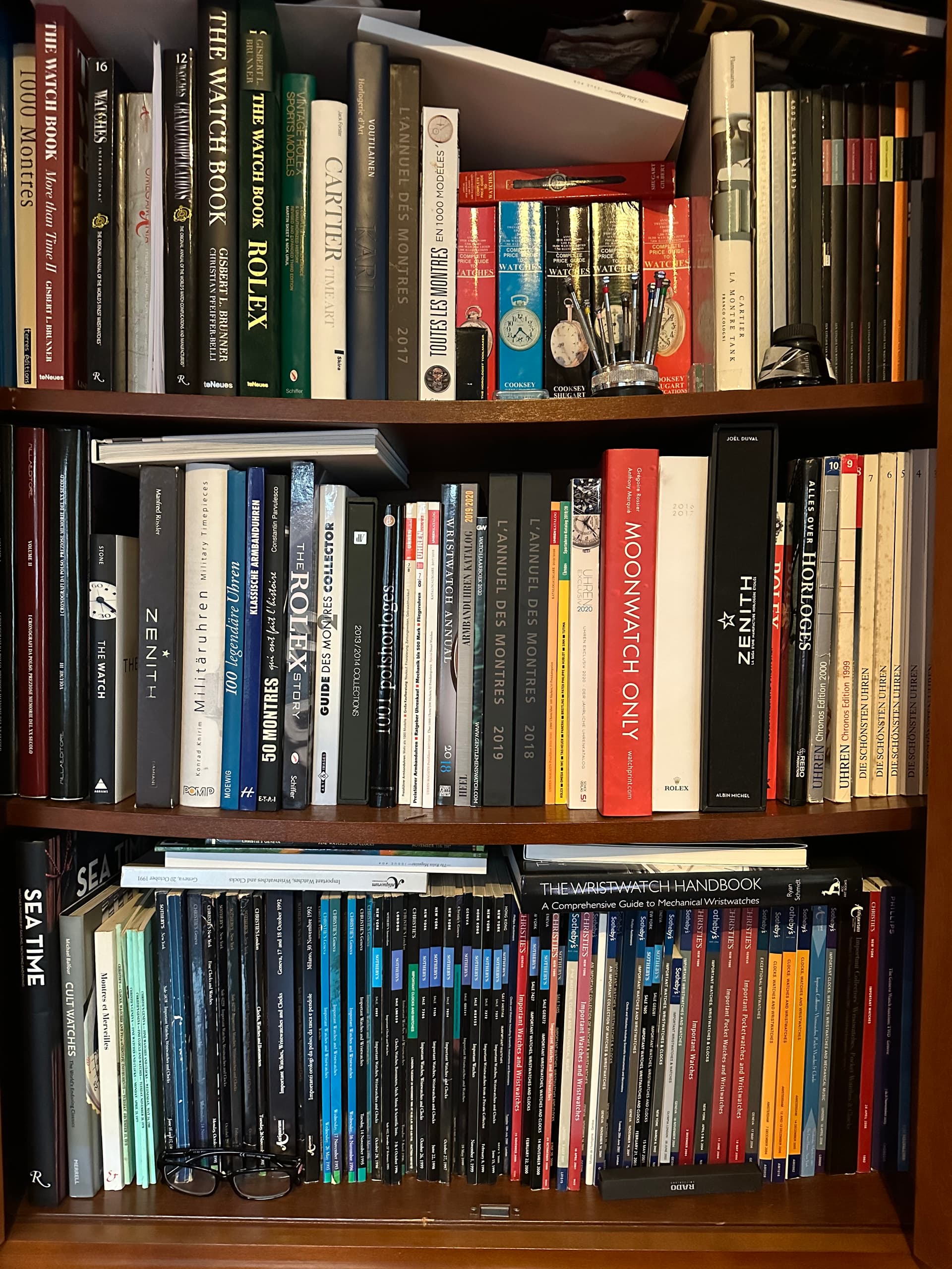 Naast horloges zelf kan ik er enorm van genieten in horlogeboeken te bladeren en lezen. Internet is wel leuk, handig en snel maar op je gemak in de sofa een boek lezen blijft veel leuker dan scrollen op een iPhone of tablet. Bovendien moet ik helaas constateren dat de informatie te vinden in boeken veel correcter is dan de onzin die we vaak op sites en vooral social media zien en lezen.
