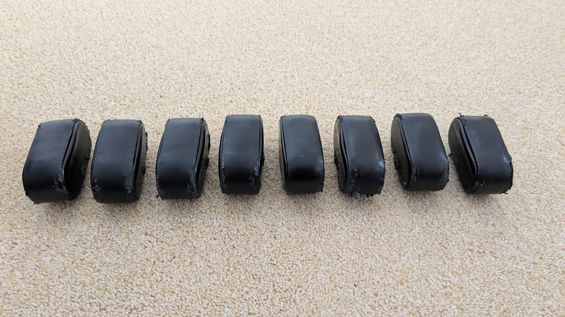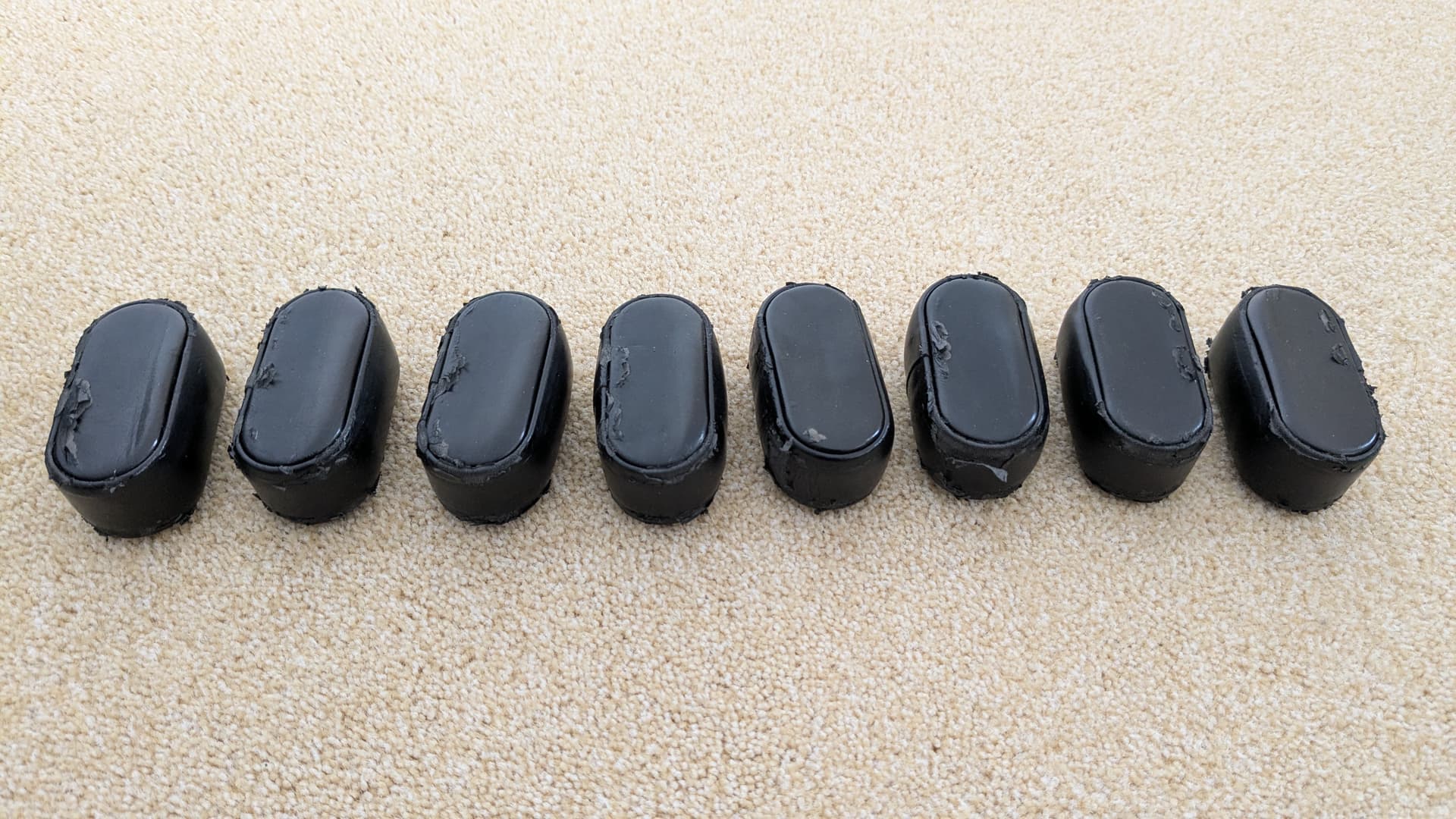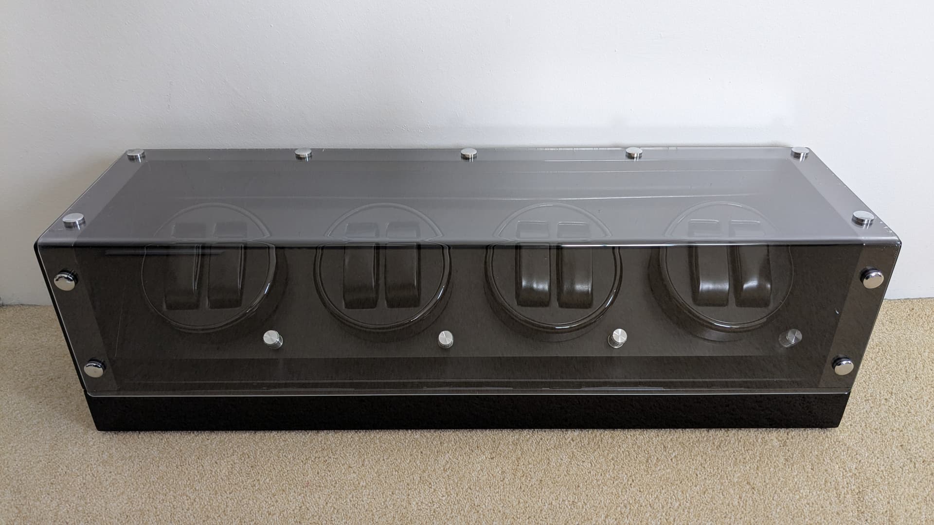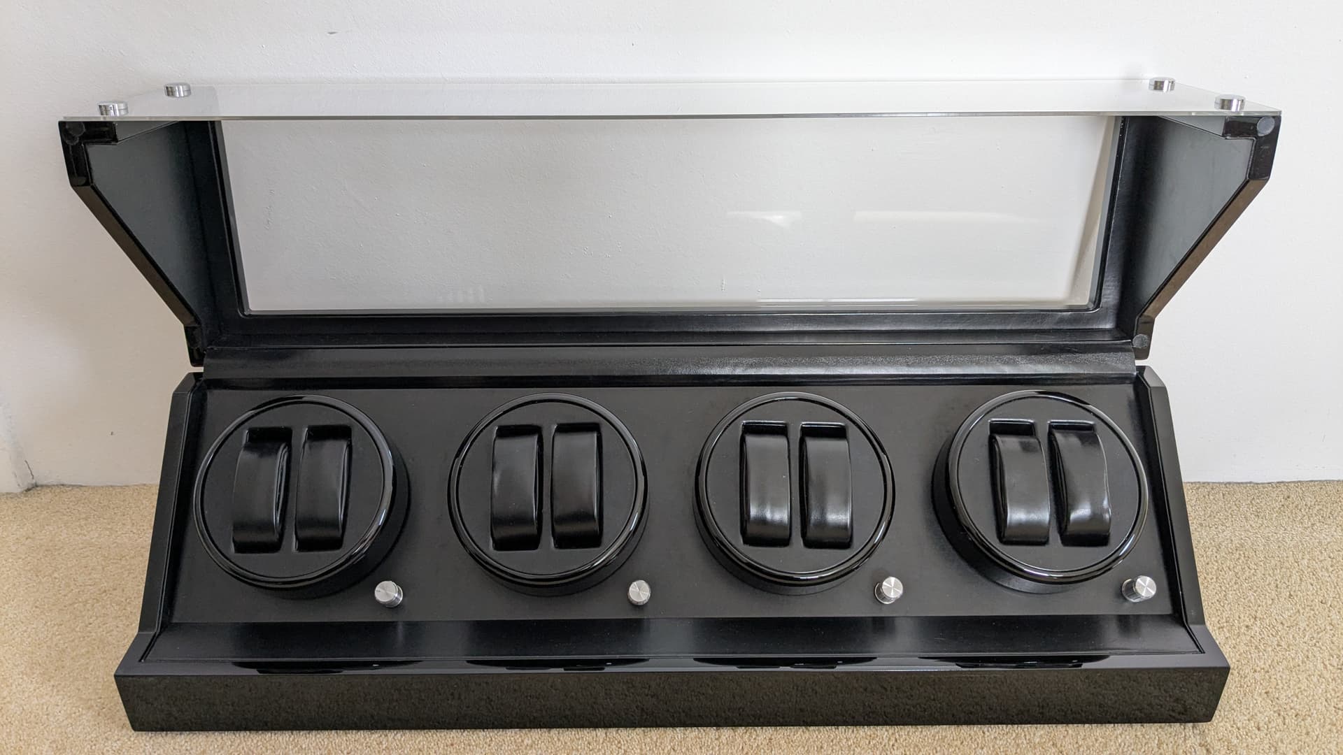 Deze horlogewinder is zo’n 5 jaar gebruikt. De motoren draaien stil en soepel maar ze draaien niet allemaal exact dezelfde snelheid. De kussentjes hebben rondom slijtplekken. De omtrek van het kussentje is 16.5-17.0cm en met de ongebruikte “buitenband” is dat zo’n 19.0-19.5cm. Bij Chinese discounters zijn wellicht vervangende kussentjes te koop (breedte 28mm en lengte 70mm).