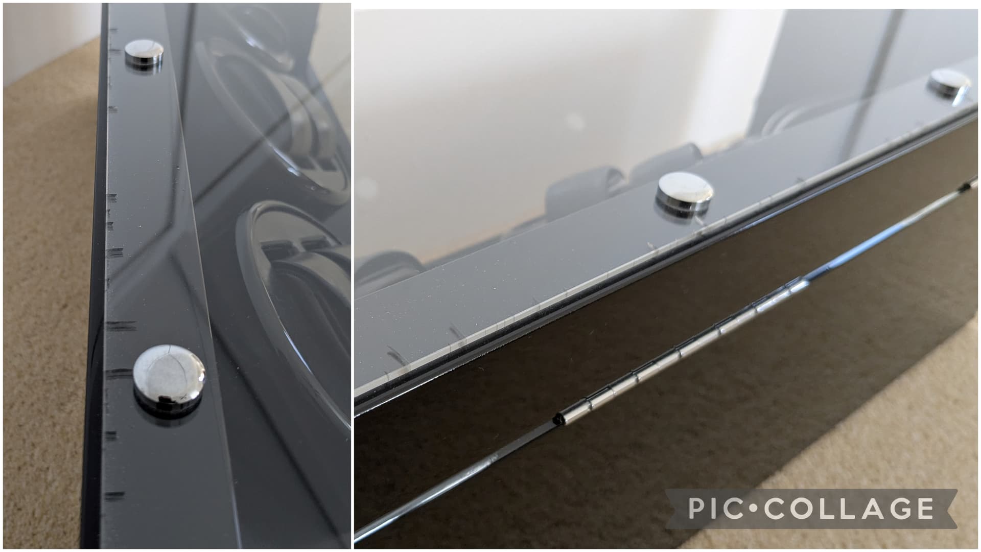 Conditie (krassen, werking etc): Redelijk, PU-leder kussentjes hebben slijtplekken, acryl-afdekplaat aan de bovenkant heeft kleine scheurtjes aan de achterkant. De extra “buitenbanden” die om de kussentjes gaan zijn ongebruikt. Zie foto’s.