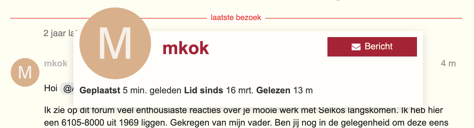 Ik zie op dit forum veel enthousiaste reacties over je mooie werk met Seikos langskomen. Ik heb hier een 6105-8000 uit 1969 liggen. Gekregen van mijn vader. Ben jij nog in de gelegenheid om deze eens na te lopen? Hij loopt nog redelijk goed, maar met name het luminee is behoorlijk van zijn schoonheid af en ik zoek ook nog een metalen bandje.