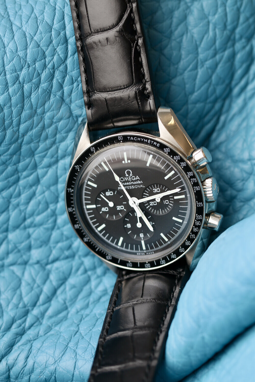 Ik denk niet dat de grijze alcantara echt past bij een bruine dial, zie hier de Speedy van de foto met mijn bruine A386;