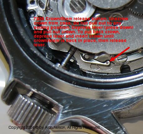 Hier onder een foto van een 7S26 uurwerk met instructie hoe de kroon te verwijderen. Het uurwerk kan er dan uit.