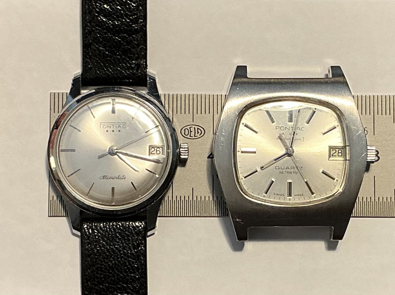 Ik heb nog een Pontiac Memodate handopwinder uit de jaren 60 liggen die ooit van mijn vader was, links op de foto hieronder. Hij loopt wel, maar in 24 uur tijd loopt hij 20 minuten achter… De achterzijde heeft duidelijke ‘Perlon-uitslag’ en aan de zijkanten van de kast heeft zweet de chroomlaag nogal aangetast. Van een onderhoudsbeurt zie ik vooralsnog af omdat ik niet verwacht hem ooit te dragen.