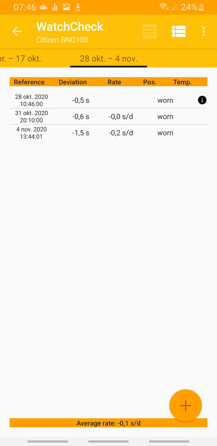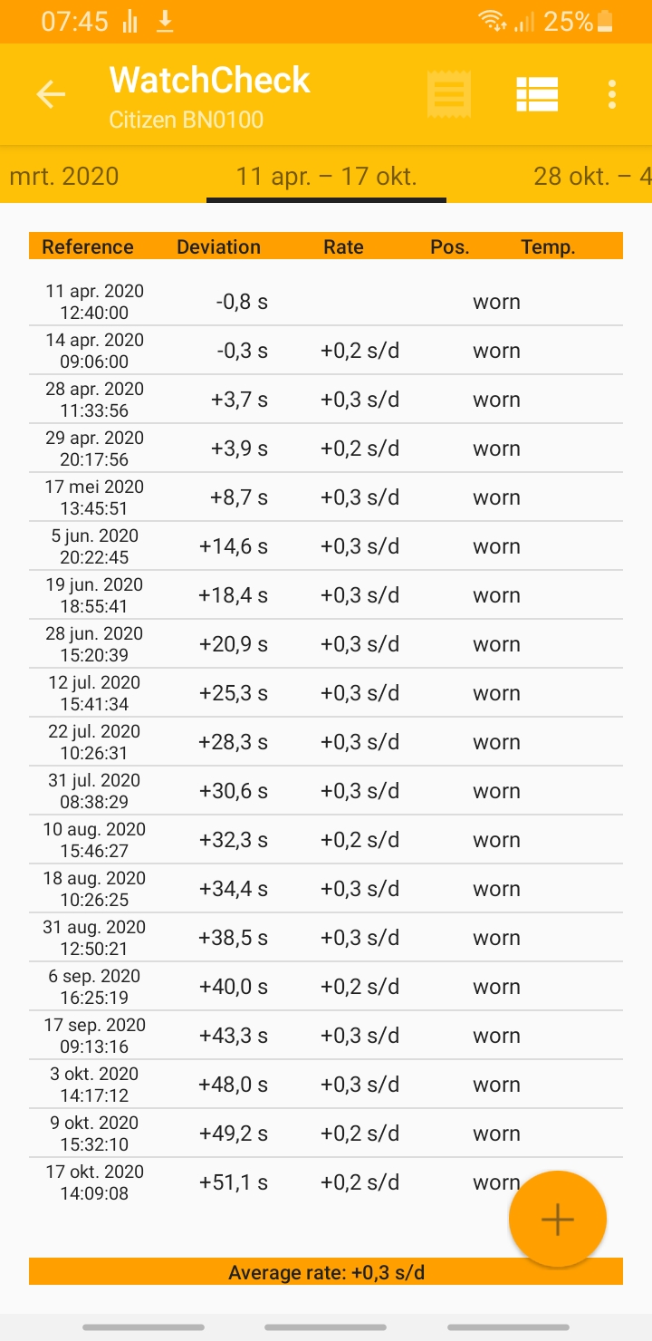 De Citizen loopt vanaf het begin steevast een (keurige) +0.2 sec/dag.
