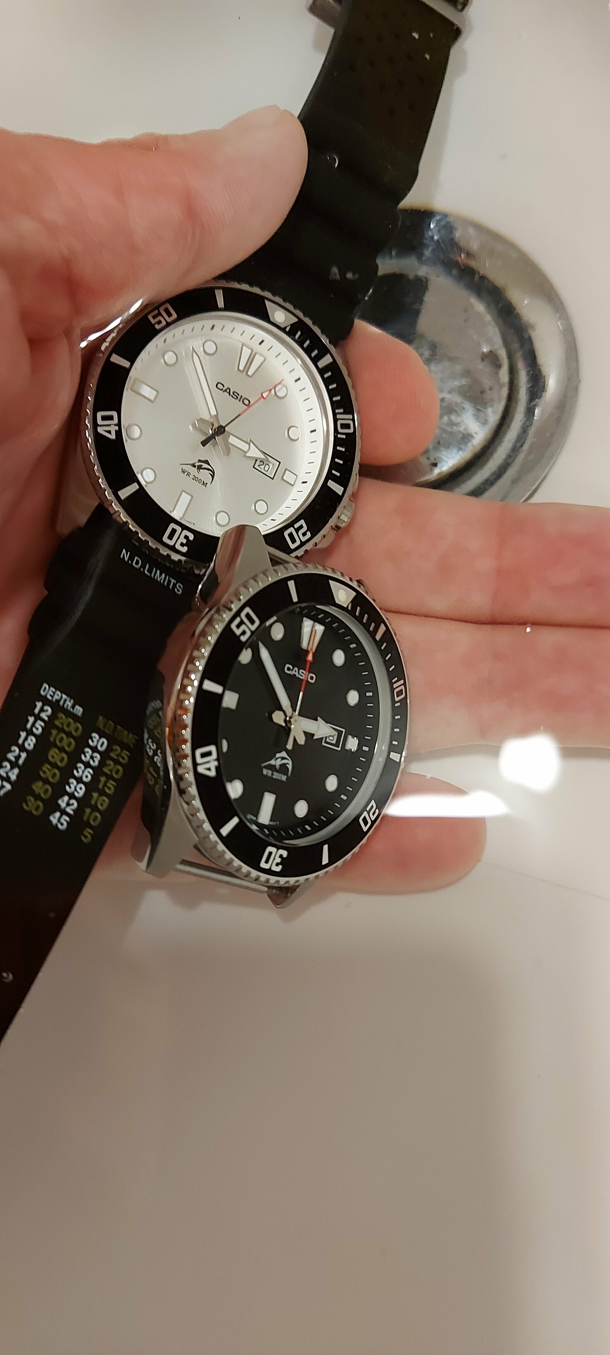 En hier nog een duidelijk effect van de olie als ik 2 mdv106 horloges onder water hou en onder een bepaalde hoek de tijd probeer af te lezen.