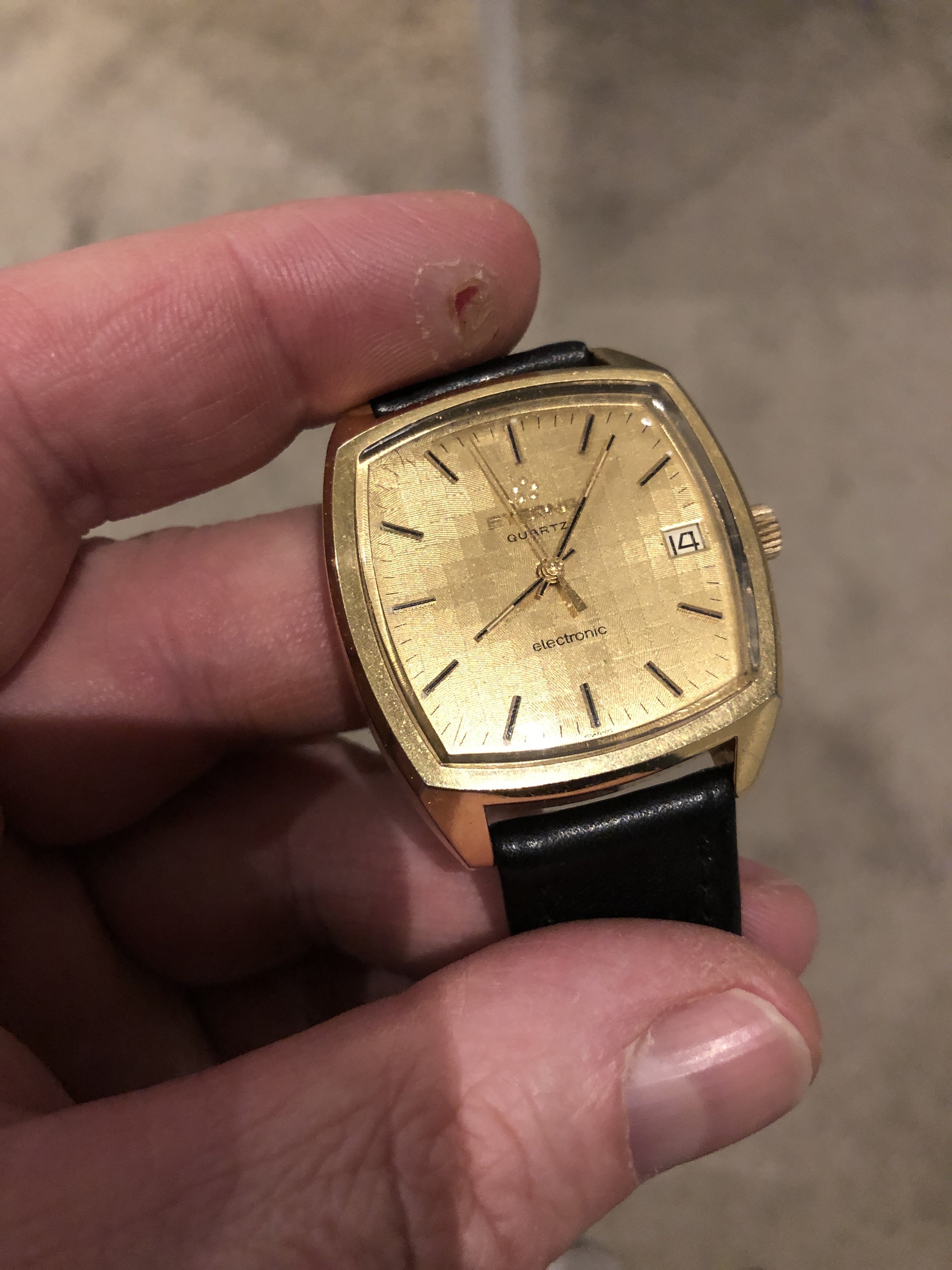 Hij lijkt een beetje op deze Eterna van 1972/1973. Dat was het begin van de quartz. Ik schat dat het horloge van ts van eind jaren 60 is.