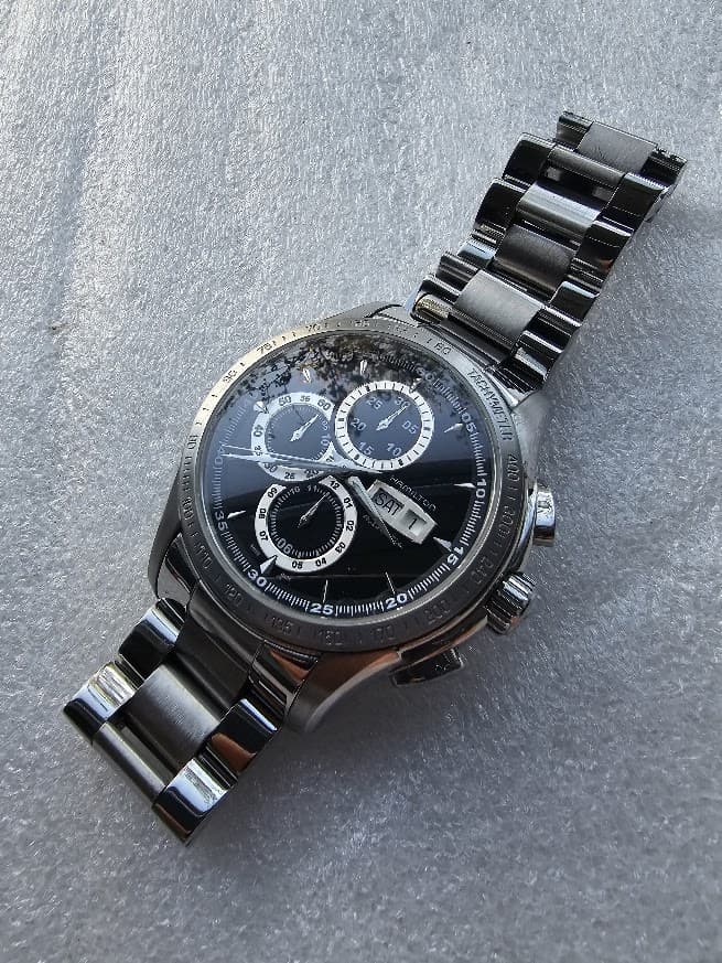 Van een verkoper die ik al langer ken. Het uuerwerk liep keurig, naar verluid, maar de bezel heeft betere tijden gezien. Maar voor VIER HONDERD EURI inclusief shipping én btw én invoerrechten was dit gewoon een ordinaire no-brainer. 46mm breed, 15.5mm dik, valjoux 7750, saffier, staal, leuke wijzerplaat… Laten we er iets van maken?