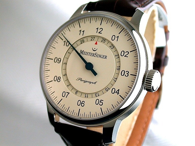 Meistersinger lijkt me ook wel gaaf, Heb ik ook nog niet zo een einzeiger… Zijn wel aardig aan de prijs. Niet gedacht. Is dat niet lastig als je precies wilt weten hoe laat t is? Een streepje staat voor 5 min dacht ik. Die geplaatste Perigraph heeft een familielid van me.