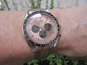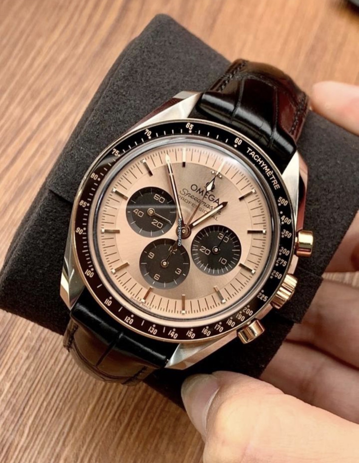 Qua Speedmasters heb ik nog een mooie suggestie voor je die relatief betaalbaar is. Panda en rosé (Sedna) goud. Op leer of, als je de extra euro’s wil neerleggen, op bracelet. Mooiste van de two-tones als je het mij vraagt.