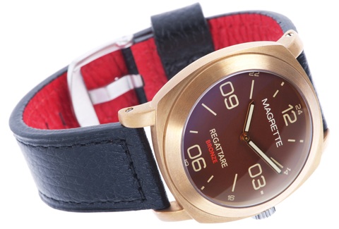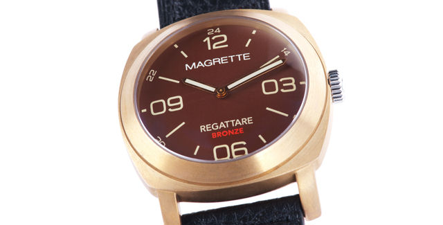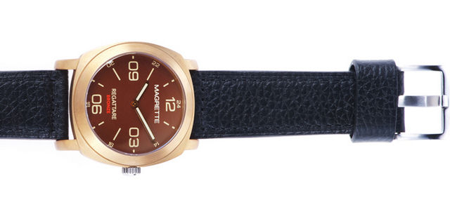 Achter de wijzerplaat verschuilt zich het uurwerk. Magrette gebruikt 2 typen uurwerken, namelijk de ETA 2824-2 en de Miyota 8215. Beide zijn bewezen automatische werkpaardjes die prima hun werk doen. In de Regattare Bronze tikt een Miyota op 21.600 BPH. Het uurwerkje heeft een gangreserve van 45 uur, dus je kunt em gerust een dagje laten staan. Ik denk dat voor behoud van de vintage uitstraling er geen gebruik is gemaakt van de datumfunctie van het uurwerk.