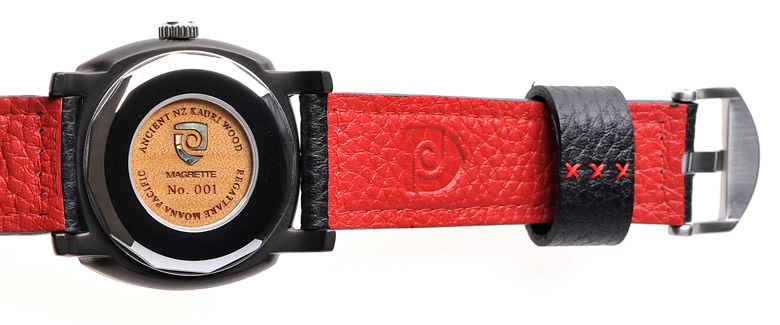 Op klokjes met een mechanisch uurwerkje zie ik graag een see-through caseback zitten. Dat is hier ook het geval, alleen… is het uurwerk niet te zien. En voor 1 keer vind ik ’t niet erg. Ik vind namelijk dat Magrette iets aparts heeft gedaan met de achterzijde. Je kijkt namelijk niet tegen het uurwerkje aan, maar krijgt een authentiek stukje eeuwenoud Kauri hout te zien. Hierop is onder andere het gelimiteerde nummer van je klokje te zien. Vraag me eigenlijk af hoe het erin is gemaakt.