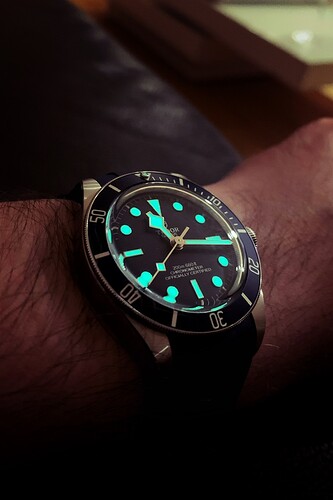 Aha. Ok, dank voor de toelichting. Als hier nou de blauwe rolex lume op zou zitten was dat toch veel mooier? Of past het dan weer niet bij de kleur blauw van de plaat? Lastig…