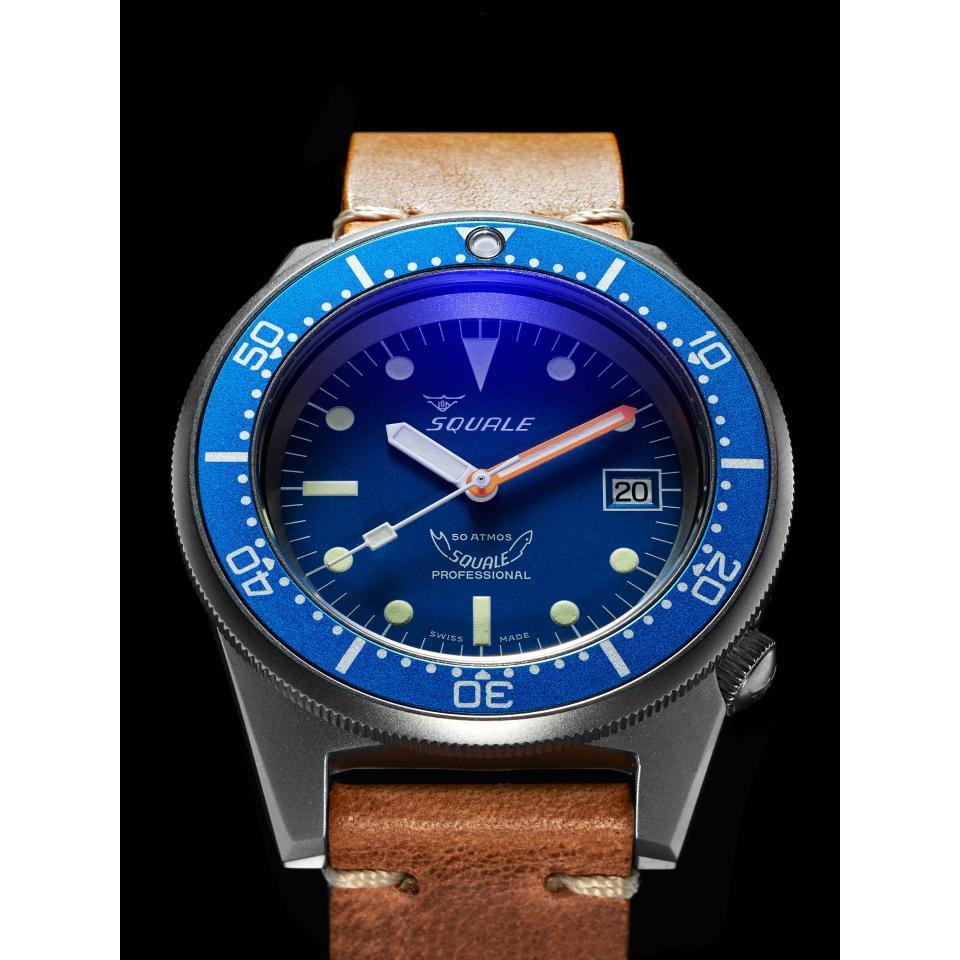 De blauwe is een horloge die ook bol staat van de details, facetranden op de aflopende lugs, mooie coin edge bezel, kast aan 1 zijde iets hoekig, aan de andere zijde een Squale inscriptie, orange minute hand, en het blauw wat erg mooi met het licht speelt, veel van deze details vallen een stuk meer weg bij de pvd versie behalve de orange minute hand.