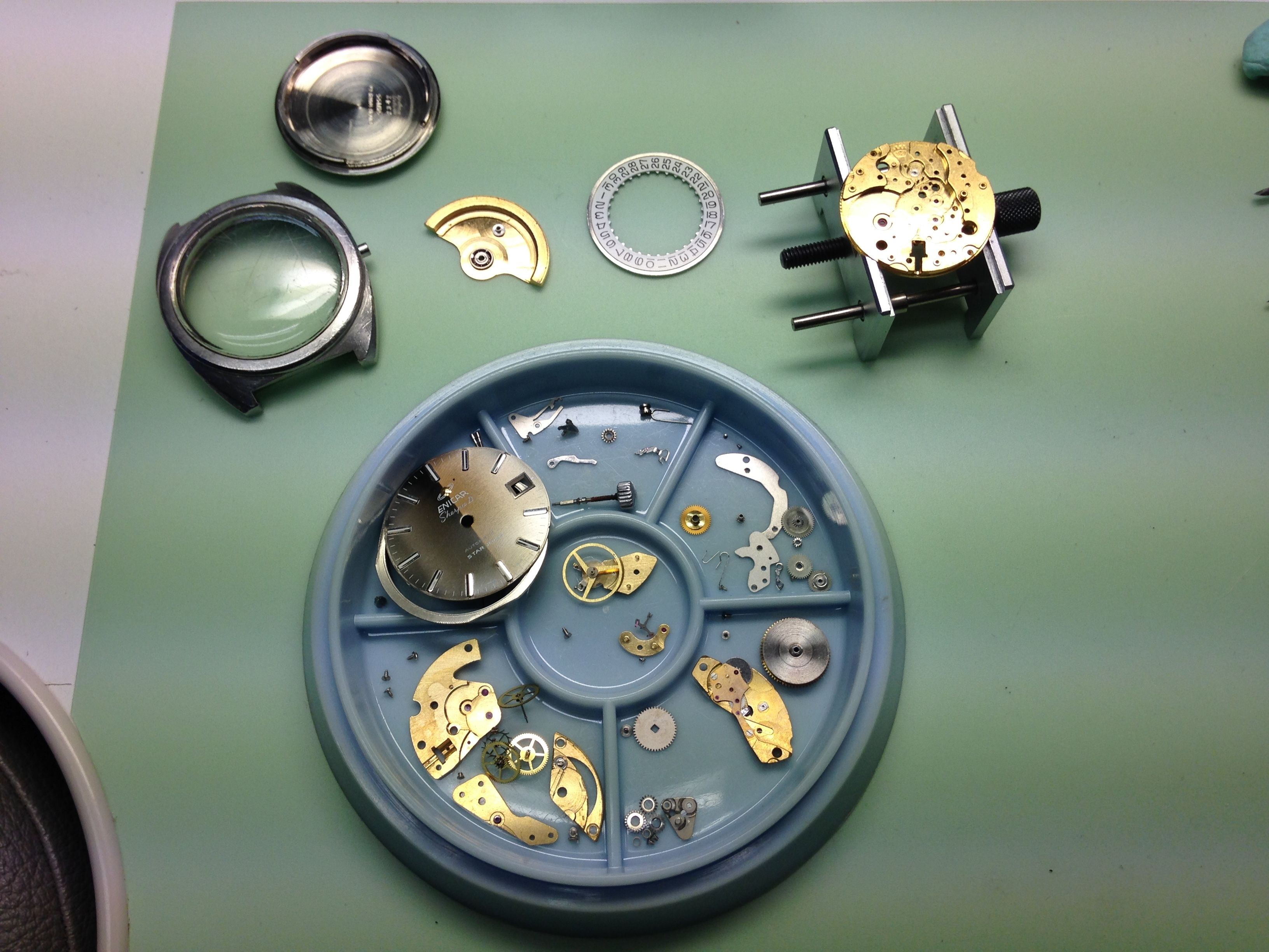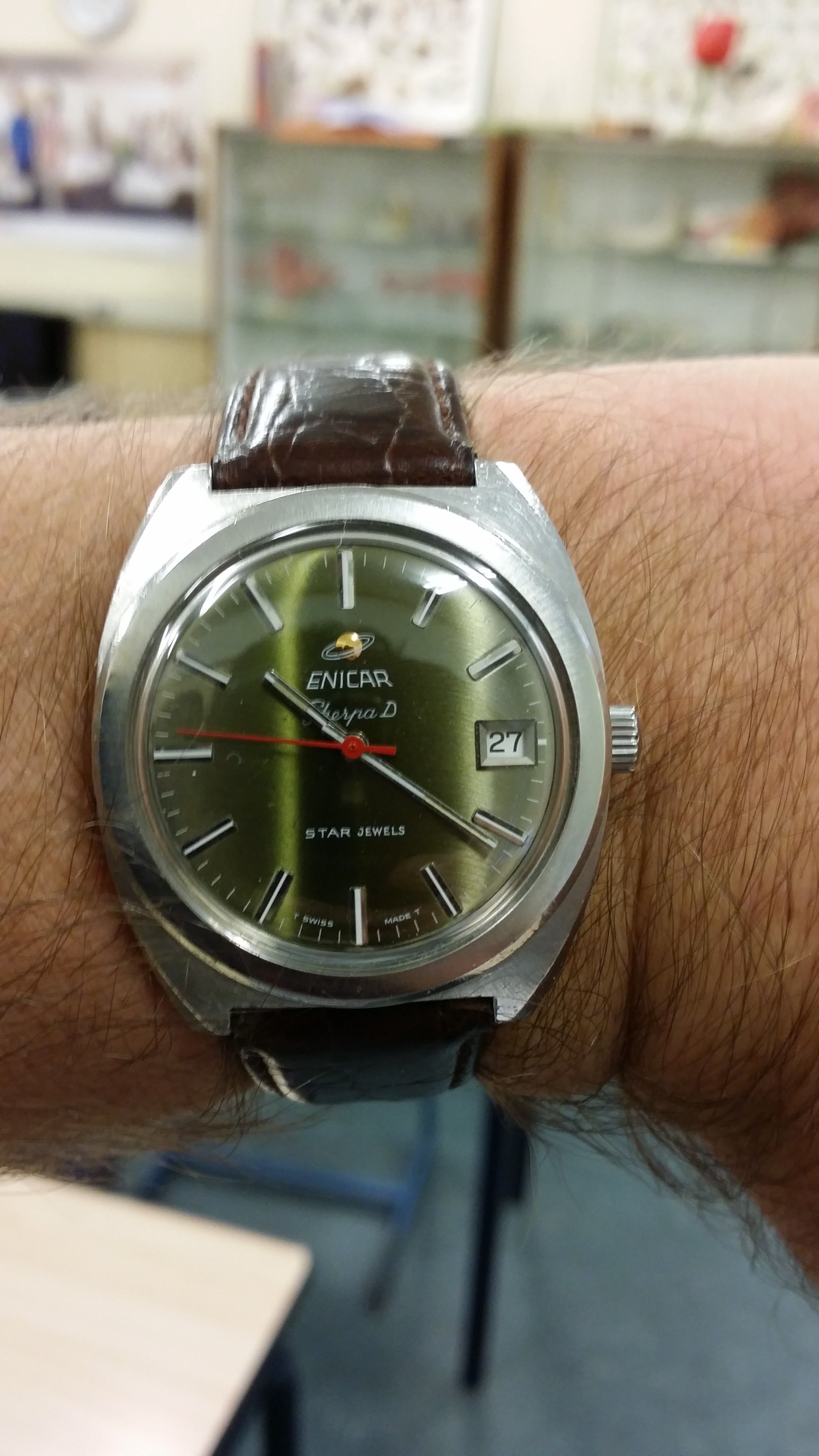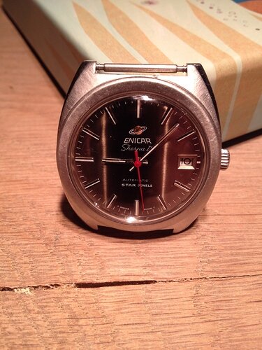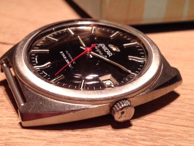 Ben erg gecharmeerd van de Enicar. Mooi merk, leuk uurwerk, prachtige kleuren en vormen (de wijzerplaat is in werkelijkheid een diep groen/goud/bruin. awesome met de fel-rode seconde)