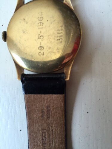 585 is inderdaad 14-karaat goud. Het horloge is waarschijnlijk door een werkgever kado gedaan in 1964. Ik vind hem de moeite waard om hem een keer te laten servicen. Als hij loopt zal dat wellicht niet de hoofdprijs gaan kosten.