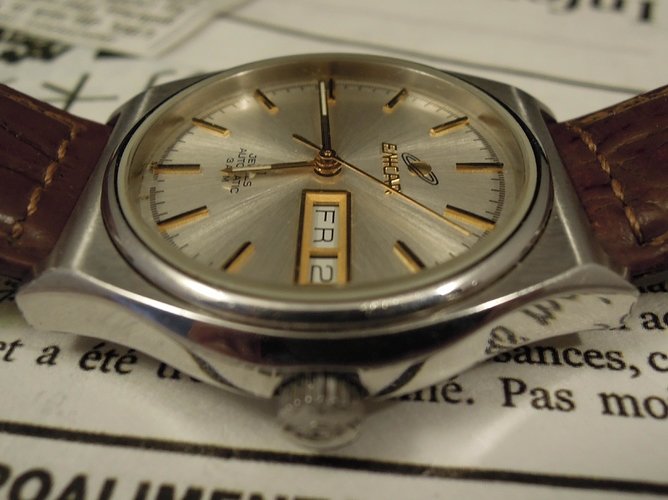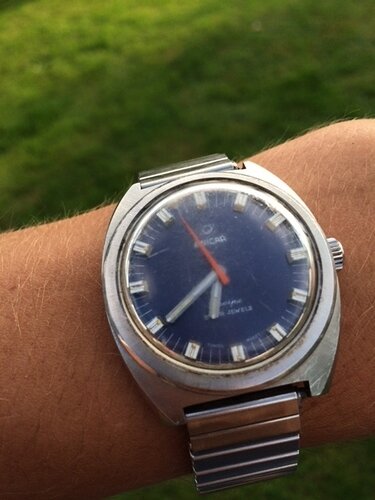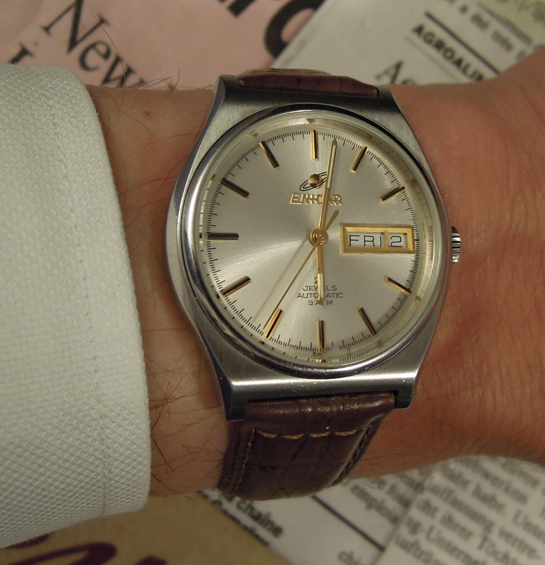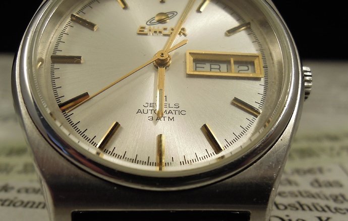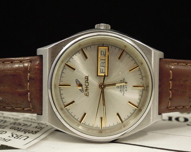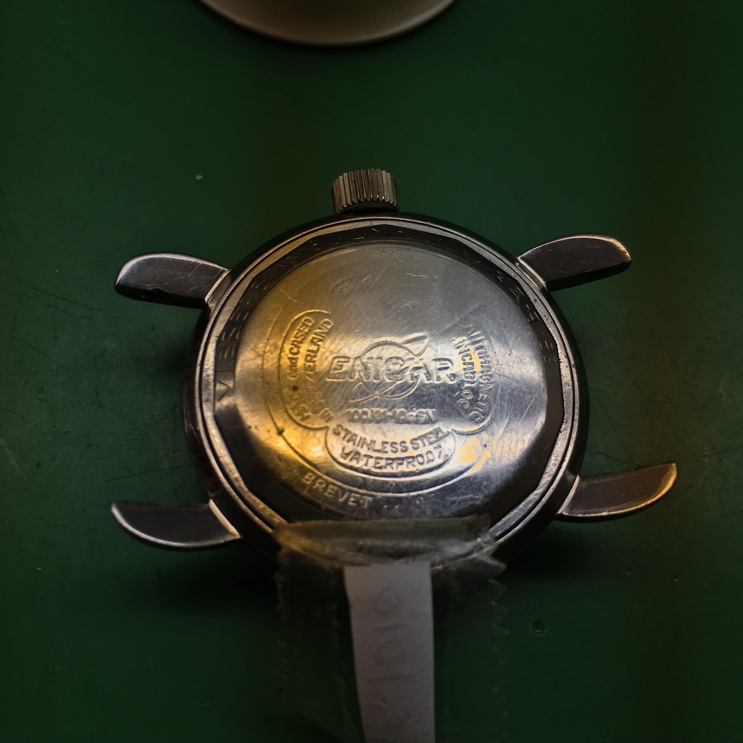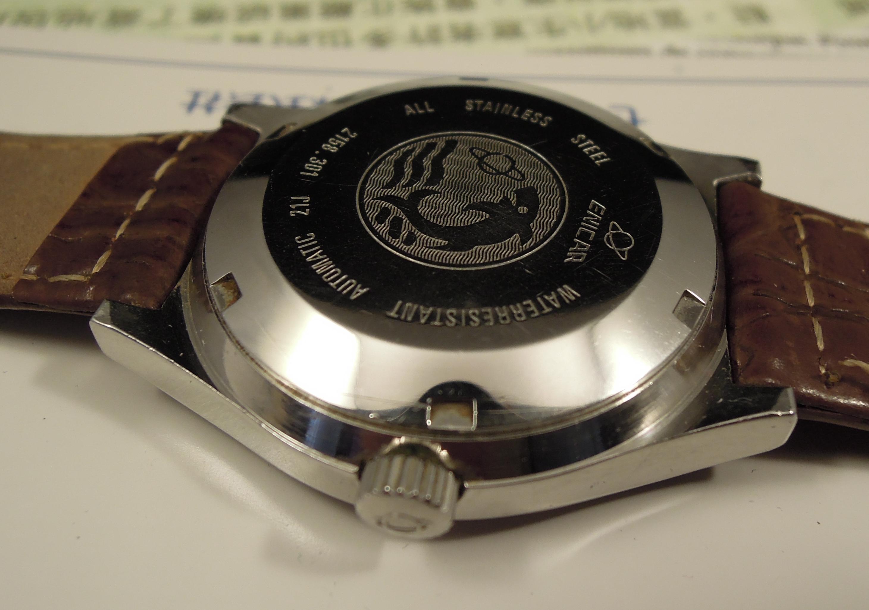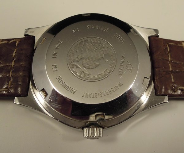Hmm, dit zou wel eens een Chinese heruitgave kunnen zijn. Nadat Enicar failliet ging zijn de onderdelen en patenten op de uurwerken overgenomen door Chronoswiss. De naam is in de jaren negentig door Chinezen gekocht en nieuw leven ingeblazen. Bi-color, de rand om het datum venster, de achterkant in combinatie met slechts 3 atm, ik denk dat dit geen Enicar is zoals wij dat kennen. De haai op het deksel stond namelijk voor 100m waterdicht dacht ik. Het uurwerk zou het kunnen verraden; als hier een afgeleide ETA in zit, dan is de oorsprong Chinees. Maar evengoed mooi en als hij goed loopt dan is er niets mis mee.